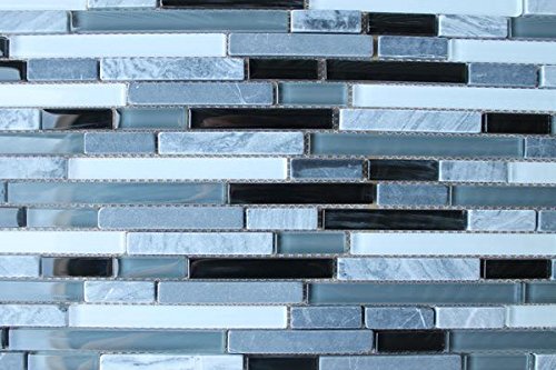 A well balanced blend of black, gray and white glass interlaced with a nice mix of gray stone mosaic strips. A great choice for a kitchen or bathroom in need of a nice cool neutral tile.