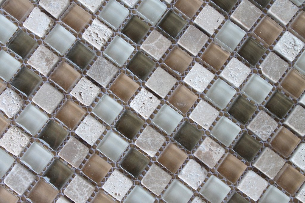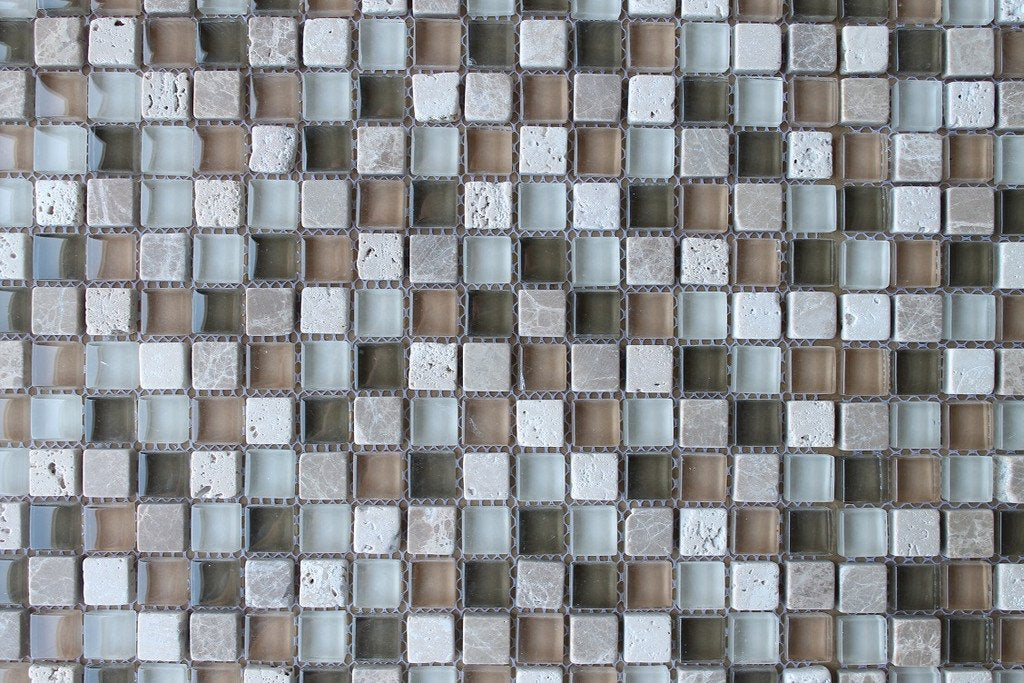A nice neutral mix of browns, white and cream colors come together in this delightful blend of glass and stone 5/8 x 5/8 square mosaics.