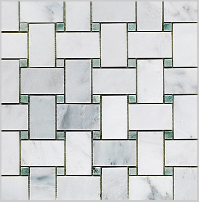 This elegantly Statuary Calacatta Marble Mosaic Floor and Wall Tile is an eye-catching statement piece for any room. Featuring a classic basketweave design accented with Ming Green Dots, the tile is composed of stunning Calacatta marble for a timeless look. Durable and easy to maintain, it is ideal for any residential or commercial space.