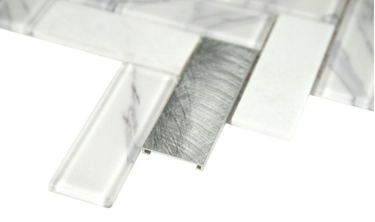 Enhance your home's walls or countertops with this Bytle Bianco Herringbone Glass metal and stone mesh-mounted mosaic wall tile. Crafted from an unglazed finish with a high/low sheen, these wall tiles feature subtle tone variations for character. They are perfect choice for a kitchen backsplash, bathroom shower or accent wall. The impervious tiles are arranged on a 12 in. x 12 in. mesh sheet for worry-free installation. These durable, frost-resistant wall tiles are constructed from metal and honed marble that is suitable for installation on walls.