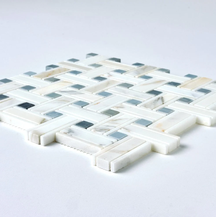 Experience timeless luxury with Calacatta Gold Kenzy Basketweave, a stunning mosaic that embodies classic Italian elegance. Crafted from polished white marble, its soft grey and warm gold veining creates an intricate, eye-catching pattern. Perfect for adding a touch of sophistication to any space, this luxurious stone brings centuries of refined beauty into modern homes