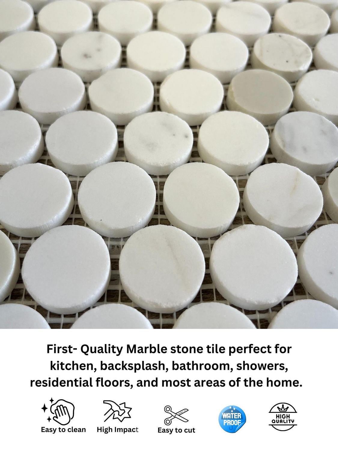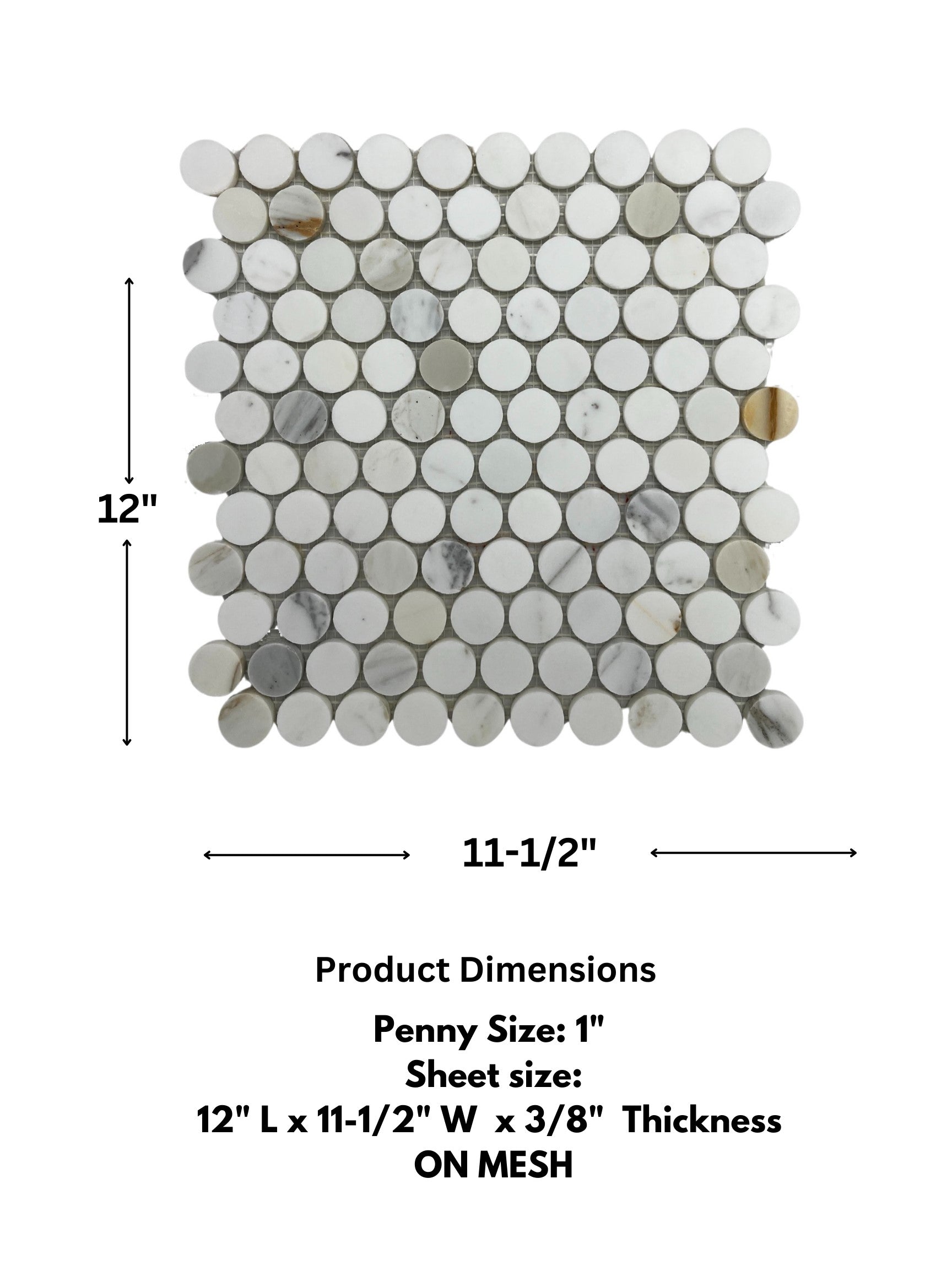 These 1-inch Calacatta Gold Penny Round Marble tiles are the perfect combination of refined beauty and durability. Honed for kitchen backsplashes, bathroom showers, and spas, they create a timeless design with a hardy, scratch-resistant surface.