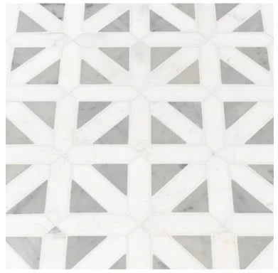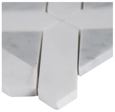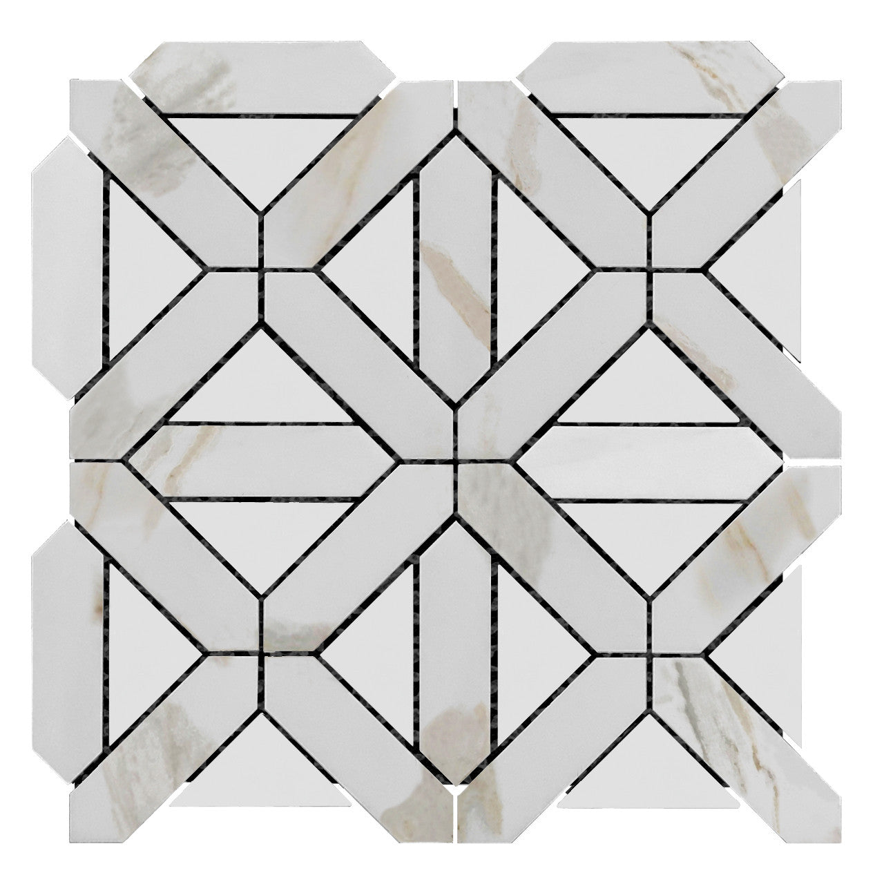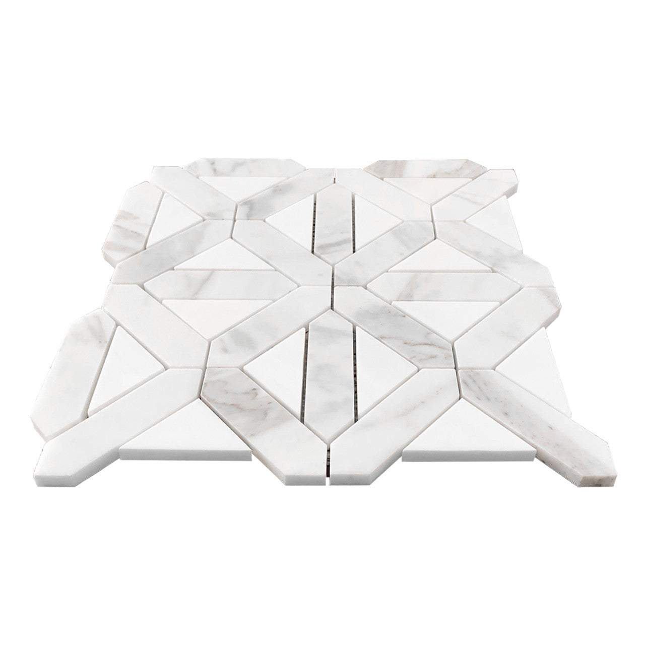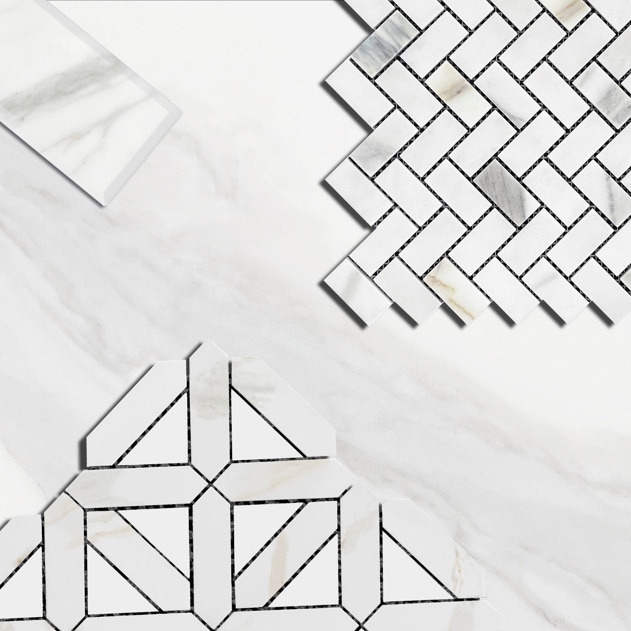 Calacatta Gold with Bianco Dolomite Geometrica Triangles Marble Mosaic Tiles are available in polished and honed finishes. Uses include kitchen backsplashes, bathroom walls, floor tiles, and shower mosaics. First-quality marble is in stock and ready to ship, with free shipping available within the continental USA. Same-day in-store pickup is also offered. Visit our showrooms for complimentary design ideas. Geometrica mosaics are perfect for both residential and commercial projects and are mainly preferred as floor tiles for their clean and aesthetic qualities. A large selection of coordinating products is available, including Calacatta Gold arabesque mosaics, Calacatta Gold herringbone mosaics, Calacatta Gold hexagon mosaics, 3x6 marble subway tiles, 12x12 Calacatta Gold marble tiles, 4x4 Calacatta Gold marble tiles, Calacatta Gold borders, Calacatta Gold moldings, and Calacatta Gold baseboards.