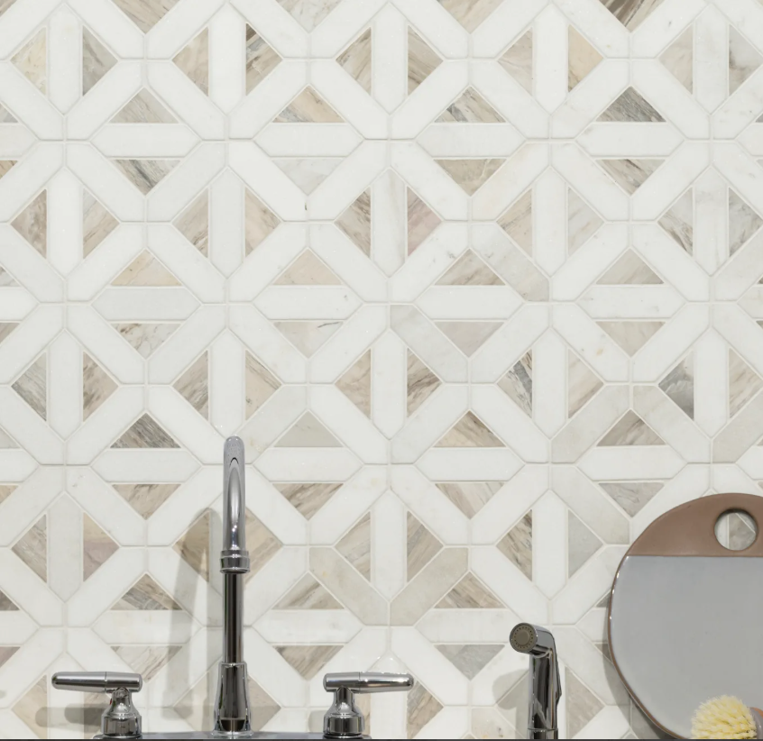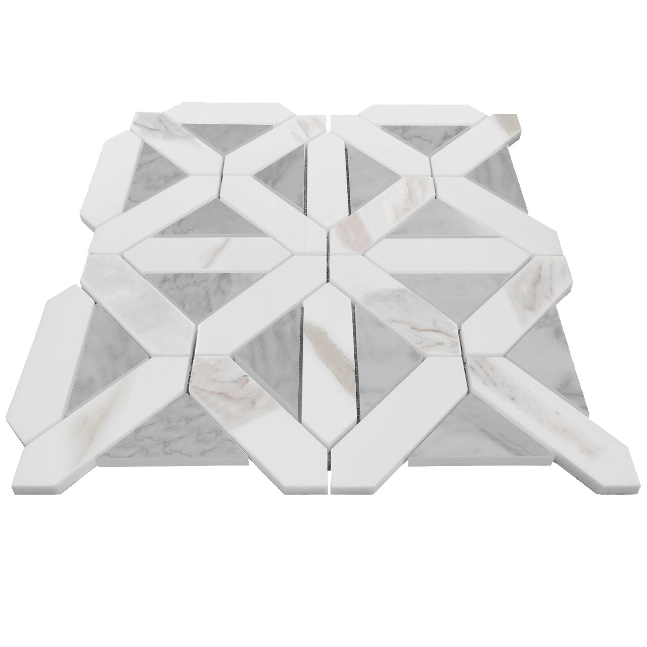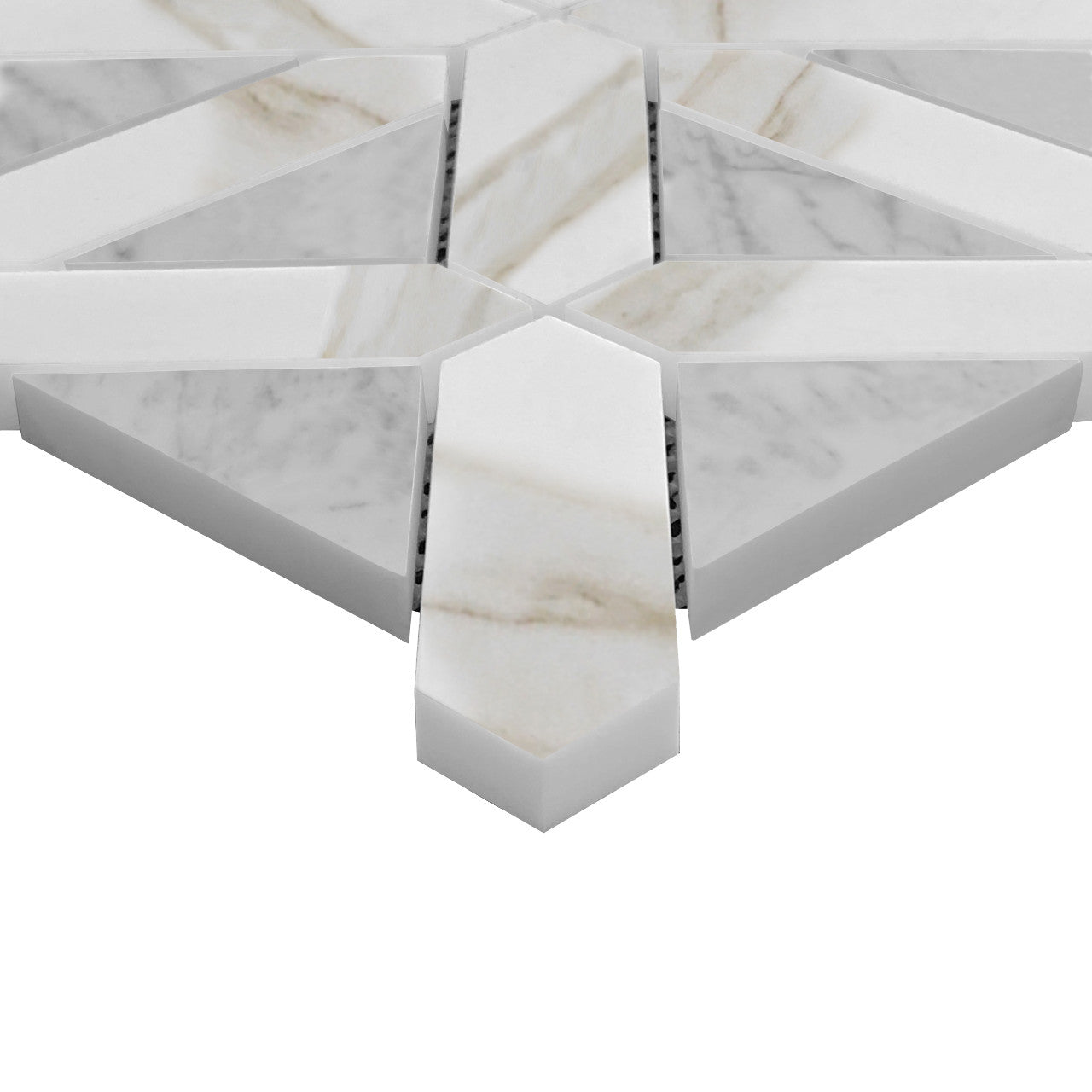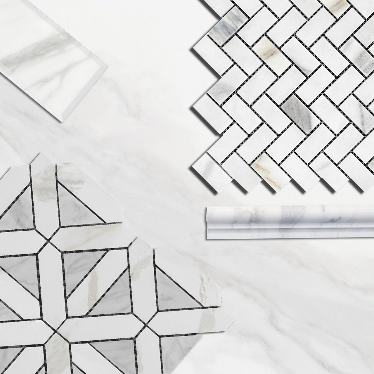 Calacatta Gold with Carrara White Geometrica Triangles Marble Mosaic Tiles are available in polished and honed finishes. Uses include kitchen backsplashes, bathroom walls, floor tiles, and shower mosaics. First-quality marble is in stock and ready to ship, with free shipping available within the continental USA. Same-day in-store pickup is also offered. Visit our showrooms for complimentary design ideas. Geometrica mosaics are perfect for both residential and commercial projects and are mainly preferred as floor tiles for their clean and aesthetic qualities. A large selection of coordinating products is available, including Calacatta Gold basketweave mosaics, Calacatta Gold herringbone mosaics, Calacatta Gold hexagon mosaics, 4x12 marble subway tiles, 12x12 Calacatta Gold marble tiles, 4x4 Calacatta Gold marble tiles, Calacatta Gold borders, Calacatta Gold moldings, and Calacatta Gold baseboards.