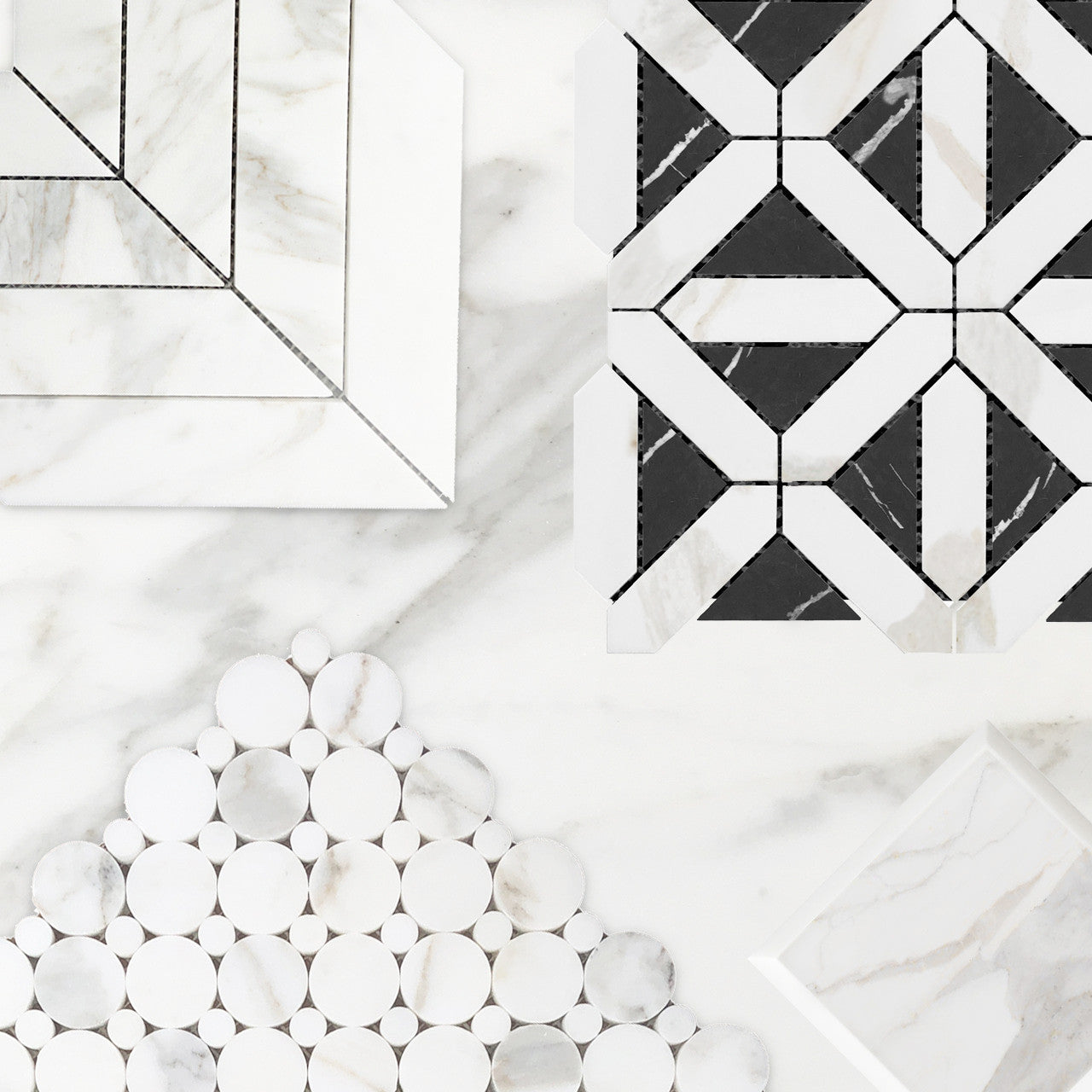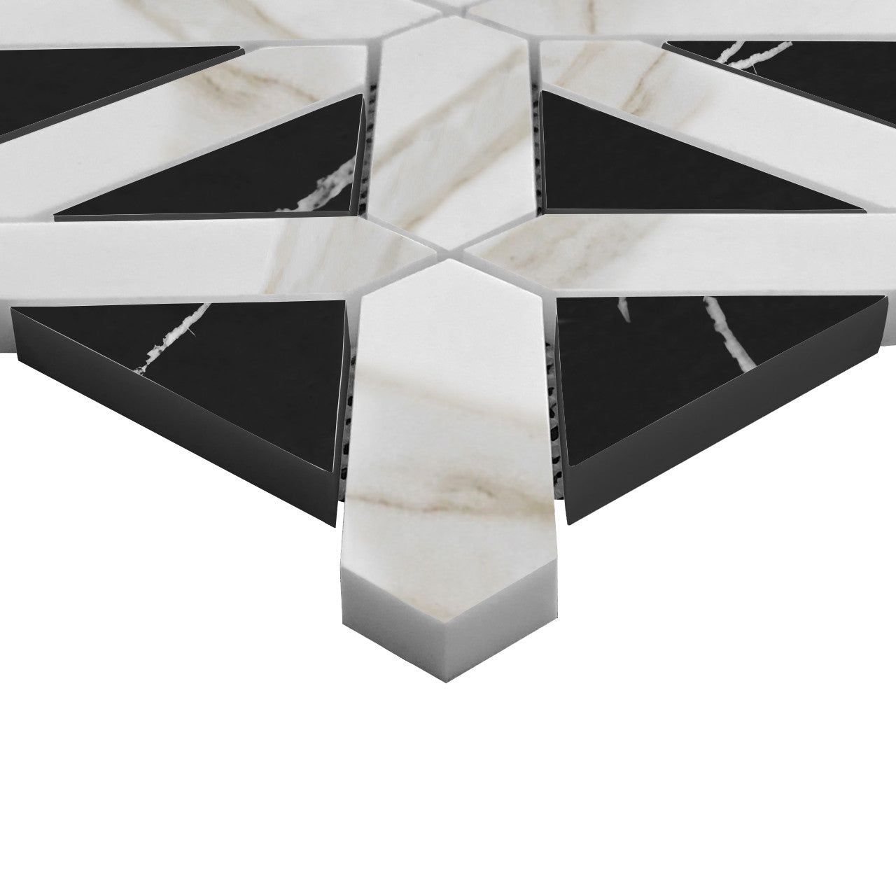 Calacatta Gold with Nero Marquina Black Geometrica Triangles Marble Mosaic Tiles are available in polished and honed finishes. Uses include kitchen backsplashes, bathroom walls, floor tiles, and shower mosaics. First-quality marble is in stock and ready to ship, with free shipping available within the continental USA. Same-day in-store pickup is also offered. Visit our showrooms for complimentary design ideas. Geometrica mosaics are perfect for both residential and commercial projects and are especially preferred as floor tiles for their clean and aesthetic qualities. A large selection of coordinating products is available, including Calacatta Gold basketweave mosaics, Calacatta Gold herringbone mosaics, Calacatta Gold hexagon mosaics, 3x6 marble subway tiles, 12x12 Calacatta Gold marble tiles, 4x4 Calacatta Gold marble tiles, Calacatta Gold borders, Calacatta Gold moldings, and Calacatta Gold baseboards.