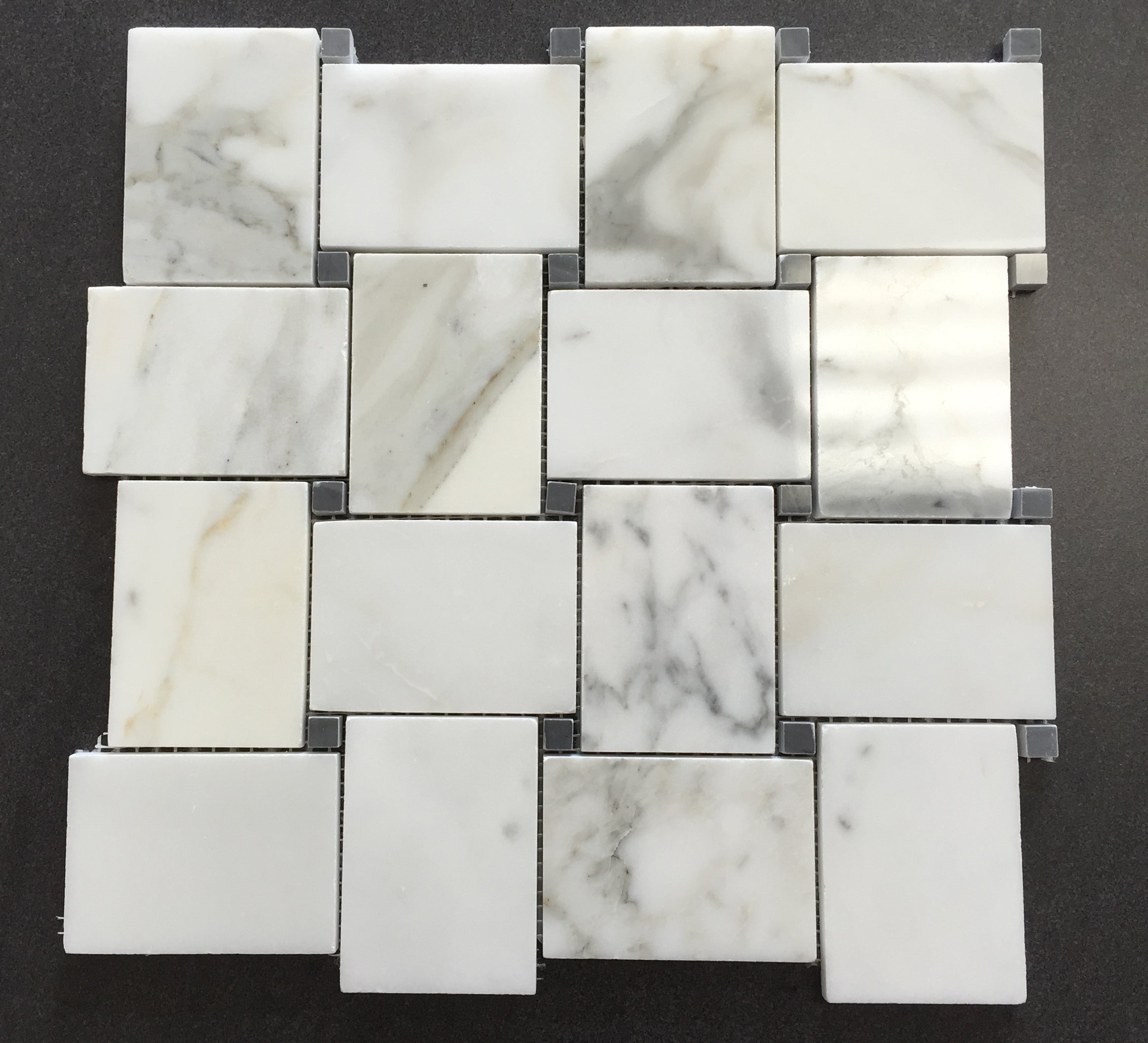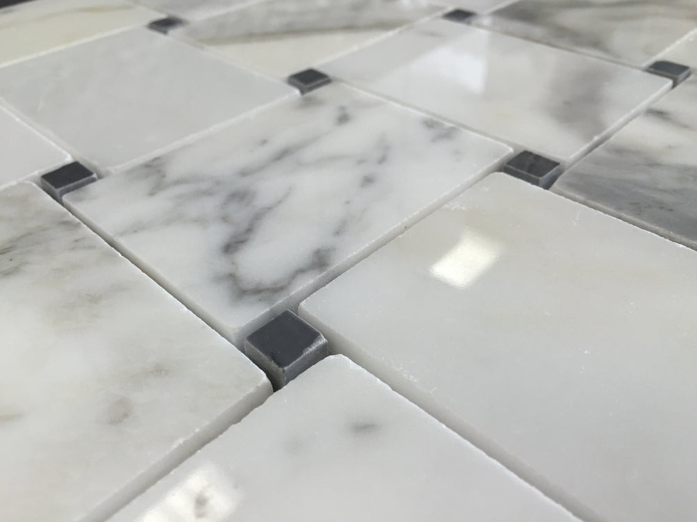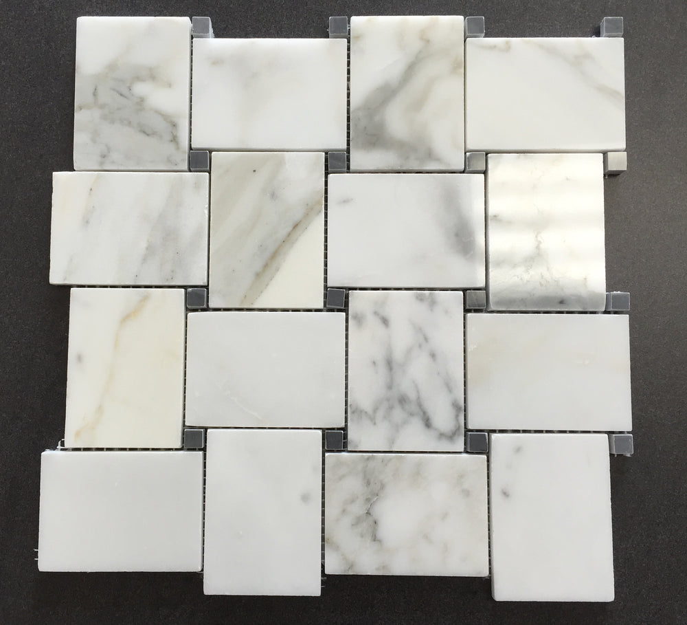Calacatta Gold Marble Large Size Big Basketweave Mosaic Tile with Gray Dots Polished for Kitchen Backsplash Bathroom Flooring Shower Surround Dining Room Entryway Corrido Spa