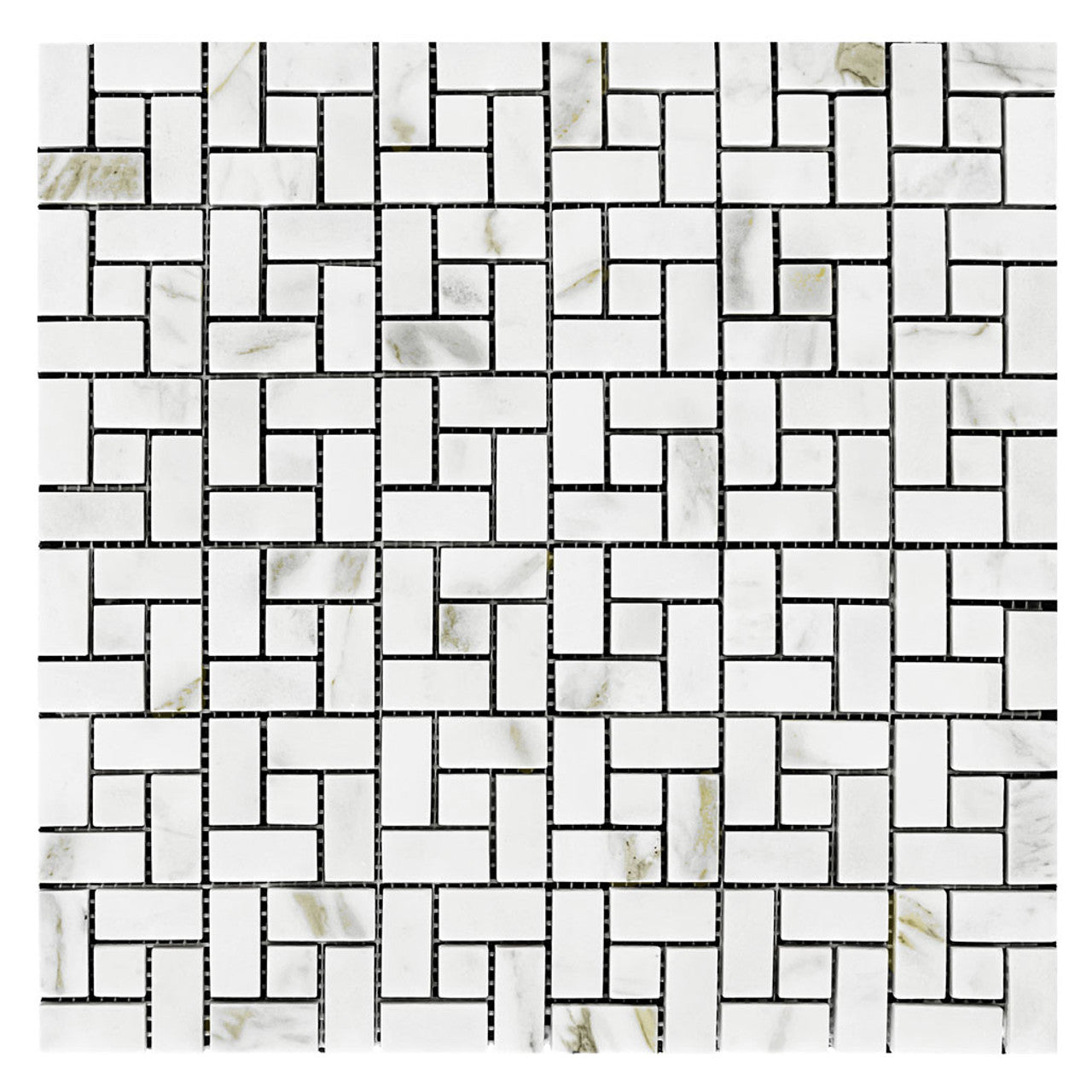 Calacatta Gold Marble Target Pinwheel Mosaic Tile with Calacatta Gold Dots are available in polished and honed finishes. Uses include kitchen backsplashes, bathroom walls, floor tiles, and shower mosaics. First-quality marble is in stock and ready to ship, with free shipping available within the continental USA. Same-day in-store pickup is also offered. Visit our showrooms for complimentary design ideas. Target mosaics are perfect for both residential and commercial projects and are especially preferred as floor tiles for their clean and aesthetic qualities.We offer a large selection of coordinating products, including Calacatta Gold basketweave mosaics, Calacatta Gold herringbone mosaics, Calacatta Gold hexagon mosaics, 3x6 marble subway tiles, 12x12 Calacatta Gold marble tiles, 4x4 Calacatta Gold marble tiles, Calacatta Gold borders, Calacatta Gold moldings, and Calacatta Gold baseboards.