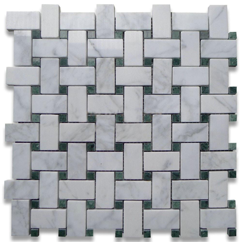 - Premium Grade Carrara Marble Italian White Bianco Carrera Basketweave Mosaic Tile with Green Dots Polished