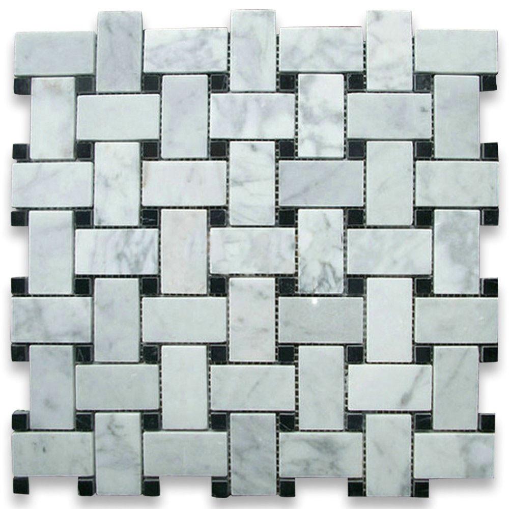 - Premium Grade Carrara Marble Italian White Bianco Carrera Basketweave Mosaic Tile with Nero Marquina Black Dots...