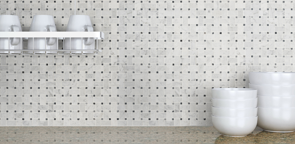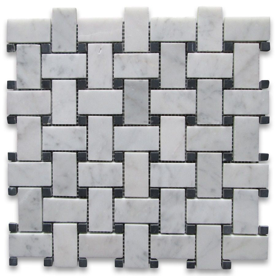 This Carrara White Italian Carrera Marble Basket weave Mosaic Floor Wall Tile is perfect for any project. Crafted from natural marble, the 1 x 2 honed tile features Black Dots throughout its intricate basket weave design for a touch of sophisticated elegance that will instantly elevate any room.