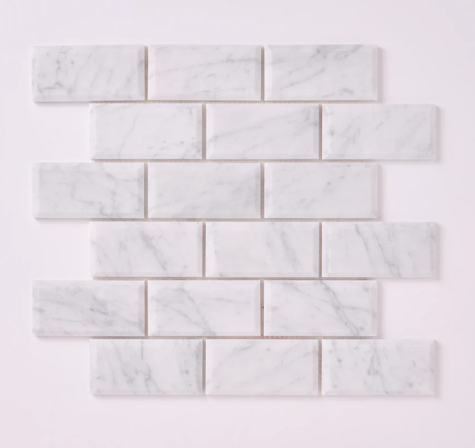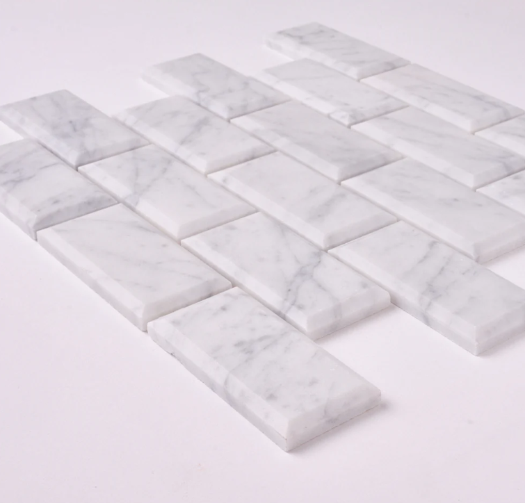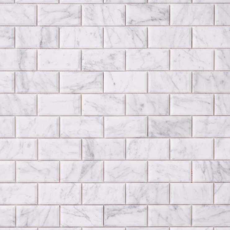 Carrara marble tiles are a classic white marble with a mixed fleuri and vein cut that blend to create subtle yet distinctive patterns. The veining in white Carrara marble is mainly grey with light to a white background, but Carrara can also have a slight gold tint to its veining that provides added dimension.