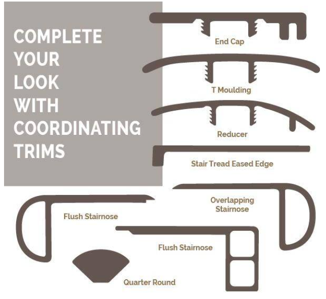 For a complete project, coordinating trims and moldings are available, and it's recommended to purchase an additional 10% of material to account for any waste during installation.