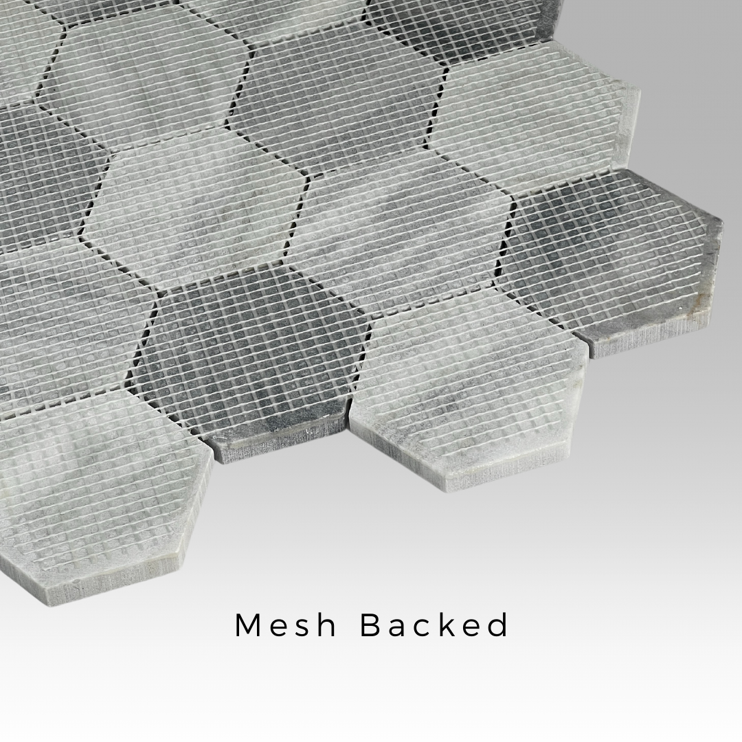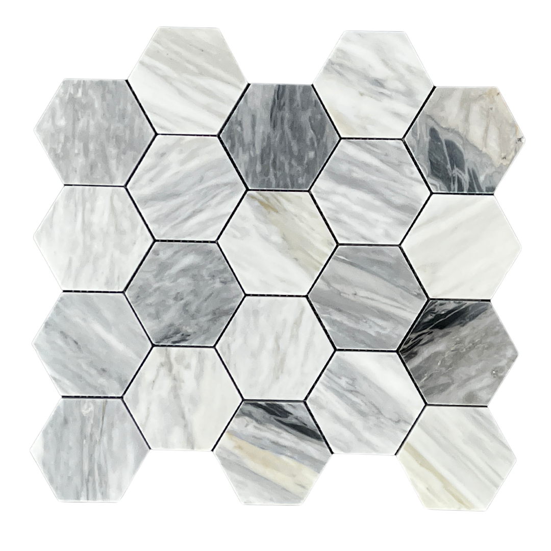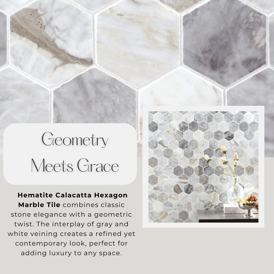 Choose the Hematite Calacatta Hexagon Marble Tile to bring a timeless and stylish aesthetic to your home. With its natural veining, a result of Earth's beauty, this marble serves as a statement piece that will remain fashionable for years to come.