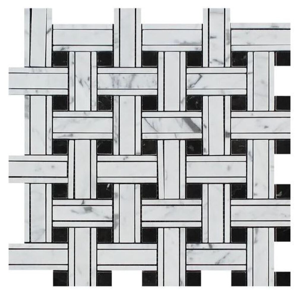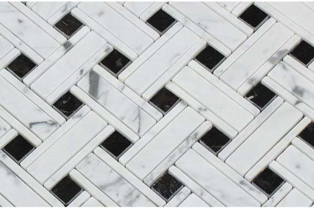 • Material: Marble - Color: White Greyish w/Black Dots - Finish: Honed - Patter: Triple Basketweave/Kenzi