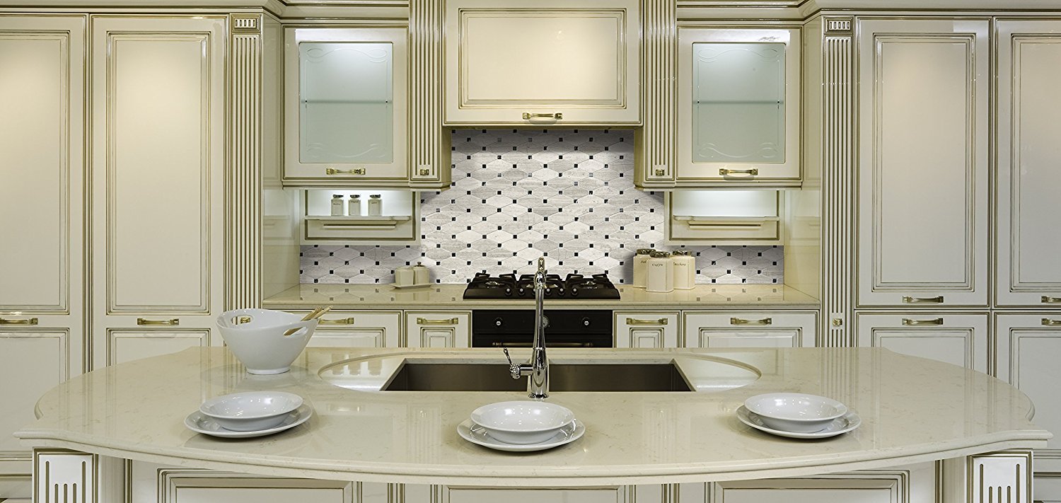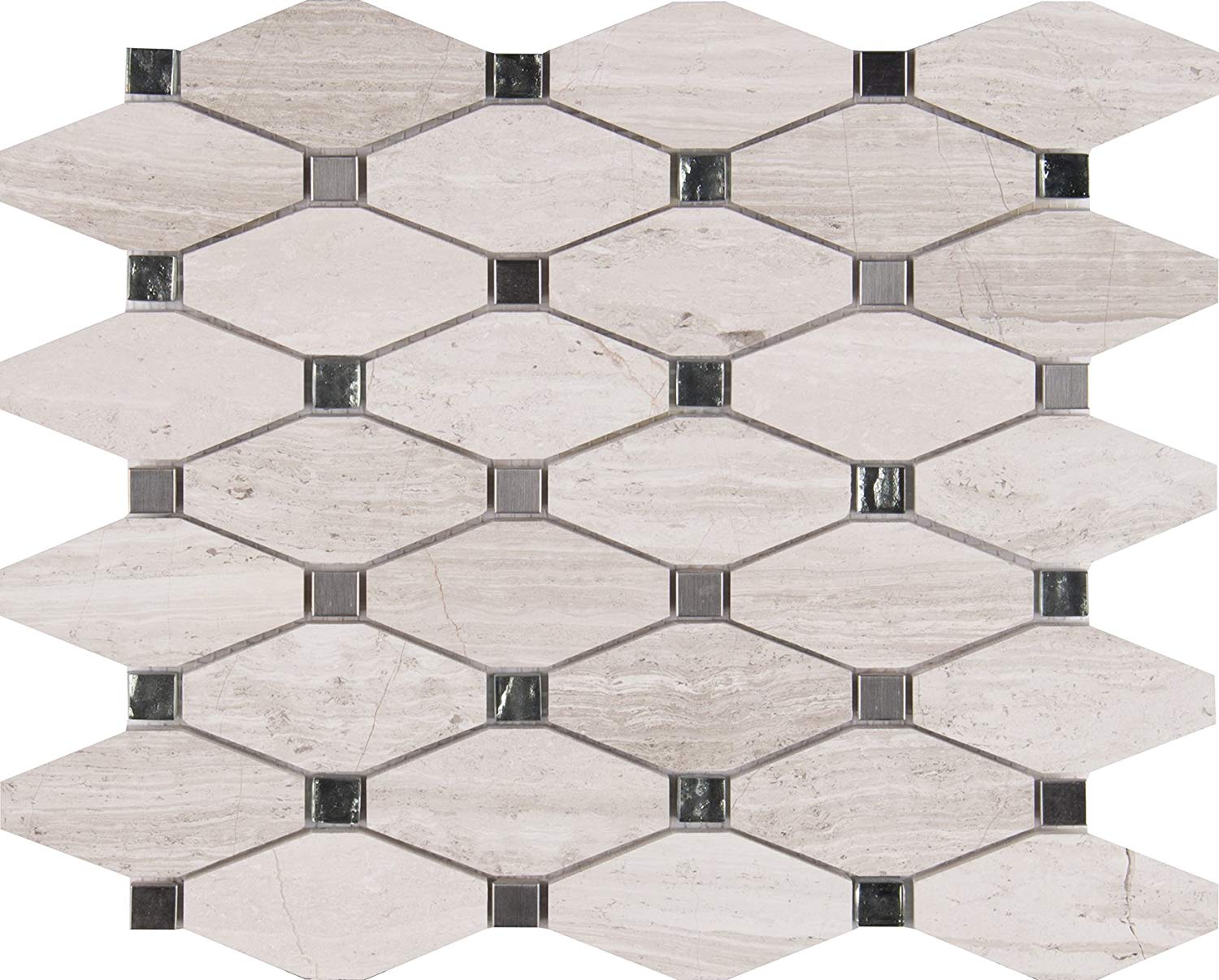 • Bayview Elongated Octagon Mosaic wall tile features a breathtaking combination of glass, stone, and metal. These tiles are mesh-backed for easy installation and are suitable for a variety of design installations including countertops, accent walls, backsplashes, showers, and dramatic wall insets. The soft white and gray tones contrast beautifully with the metal accents.