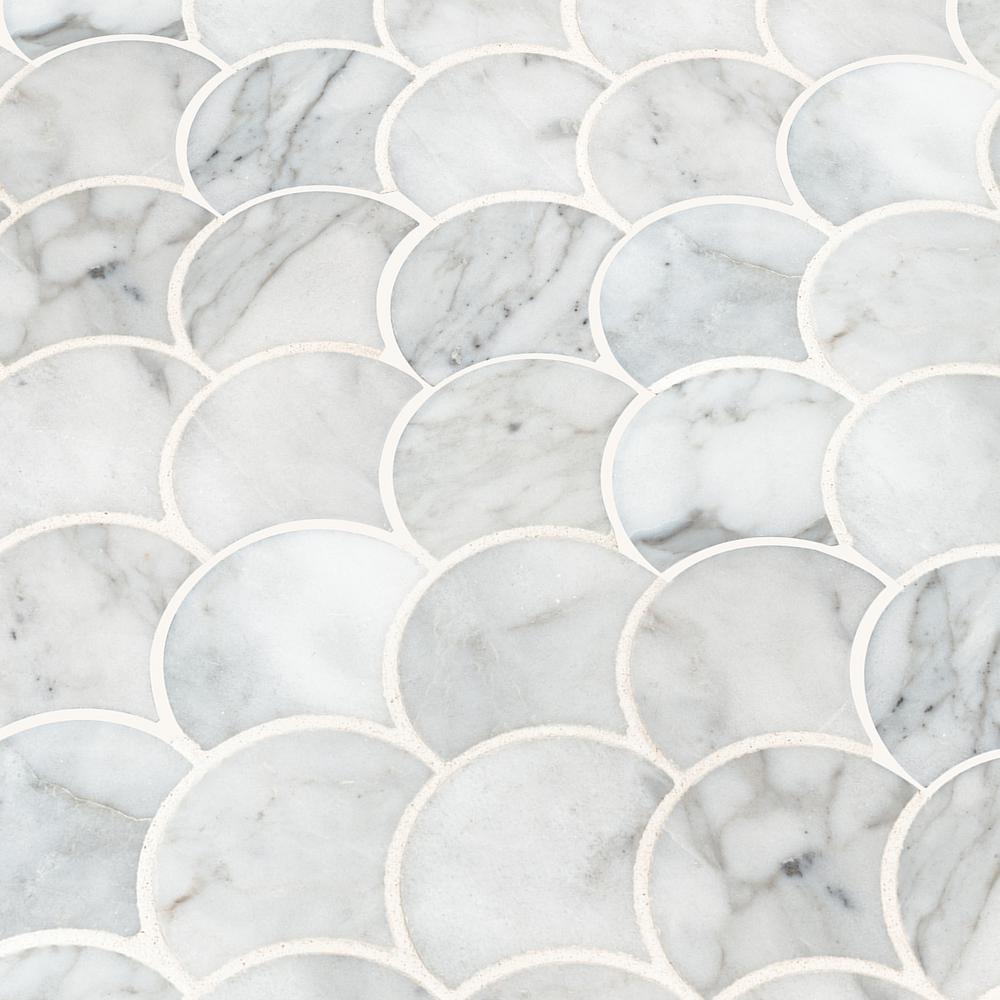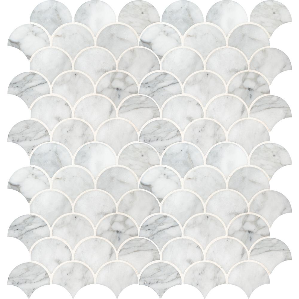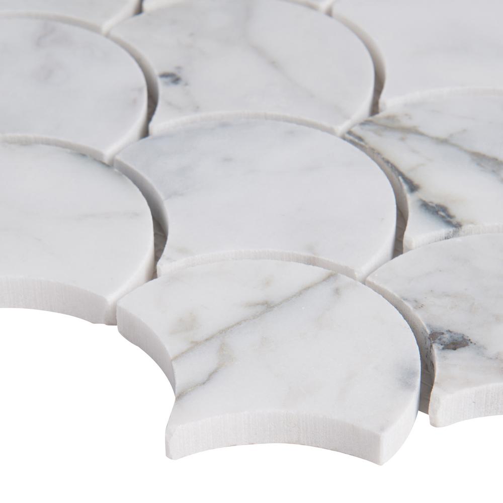 Add a splash of sophistication to your decor with Calacatta Blanco Scallop Polished Marble Mosaic Floor and Wall Tile. It features unique styled pieces of polished white Italian marble, lending an upscale look and contemporary flair to any interior expanse. The high-sheen, smooth-finished genuine stone chips are perfectly arranged on a 12.8 in. x 10.43 in. mesh-backed mosaic. Suitable for residential and commercial use, this ornate tile has a distinct pattern that is certain to inject space-defining allure into any setting. Note: Inspect all tiles before installation. Natural stone products inherently lack uniformity and are subject to variation in color, shade, finish, etc. It is recommended to blend tiles from different boxes when installing. Natural stones may be characterized by dry seams and pits that are often filled. The filling can work its way out and it may be necessary to refill these voids as part of a normal maintenance procedure. All natural stone products should be sealed with a penetrating sealer.