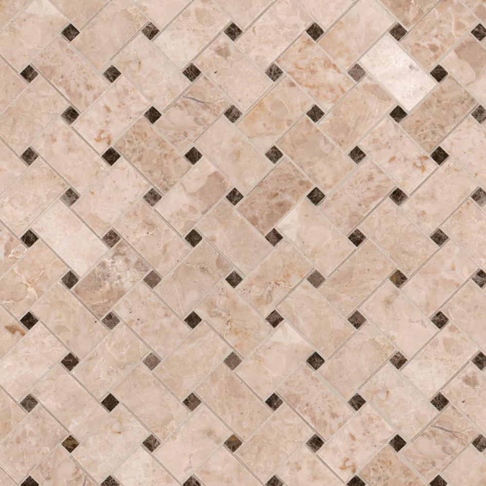 With the MSI 12 in. x 12 in. Crema Cappuccino Basketweave Mosaic Floor and Wall Tile, it's easy to add a splash of contemporary styling to your decor. This attractive tile features chips of marble tile in a basketweave pattern on a 12 in. x 12 in. mesh sheet that makes installation a much easier process. With neutral beige shades of natural marble in a polished finish contrasting with dark brown marble dots, this tile creates a distinct pattern for install in kitchens, bathrooms and other residential or commercial spaces. Note: Inspect all tiles before installation. Natural stone products inherently lack uniformity and are subject to variation in color, shade, finish, etc. It is recommended to blend tiles from different boxes when installing. Natural stones may be characterized by dry seams and pit’s that are often filled. The filling can work it’s way out and it may be necessary to refill these voids as part of a normal maintenance procedure. All natural stone products should be sealed with a penetrating sealer. After installation, vendor disclaims any liabilities.