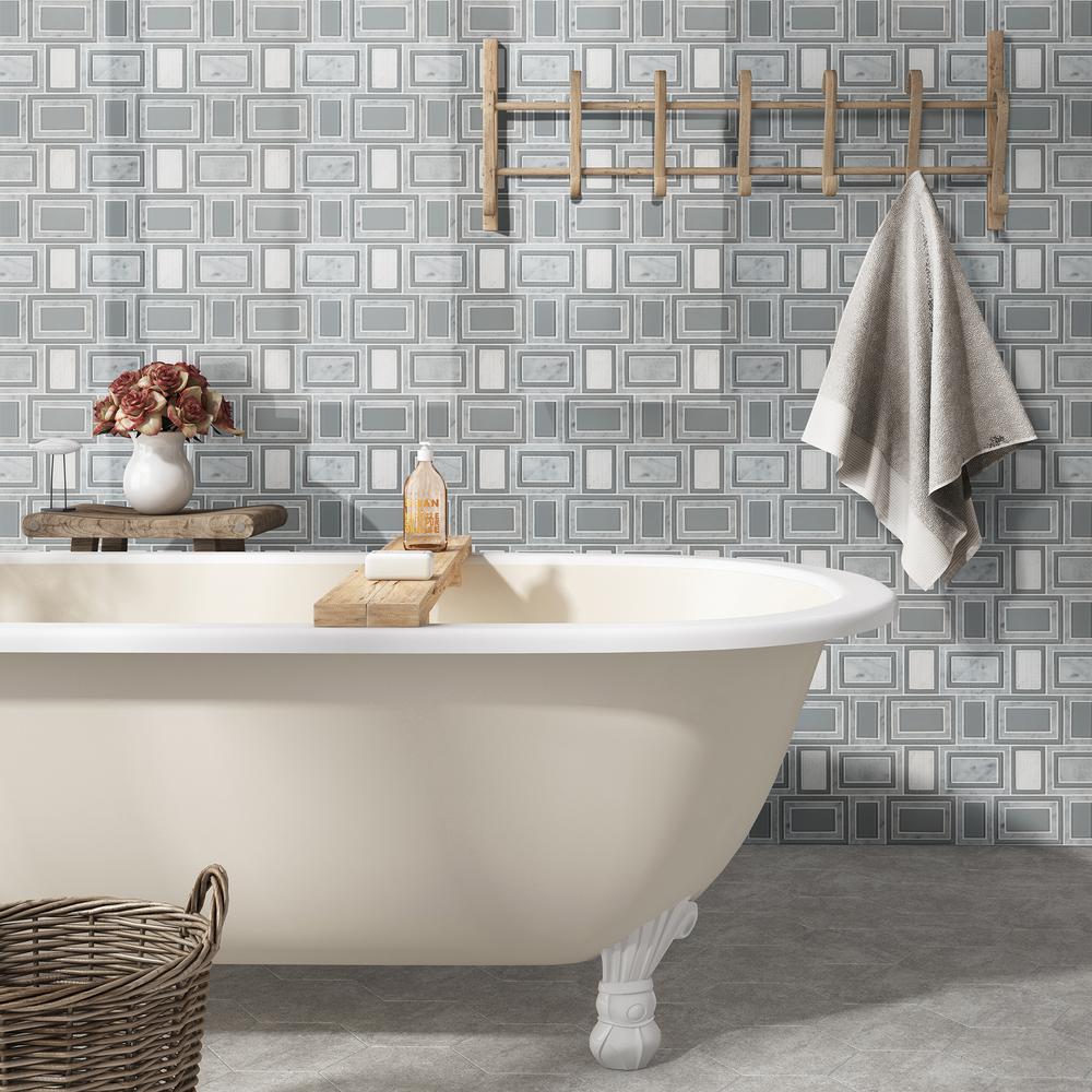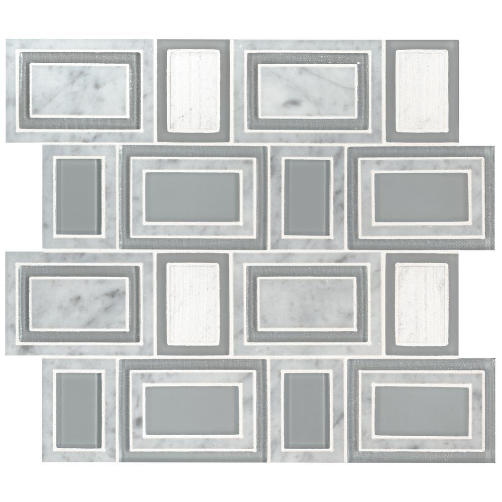 Soho Stax Pattern 8 mm Mixed Tile is an elegant and dramatic blend of glass and stone. This tile features longer horizontal and vertical slate gray, vertical snowy white tiles - and the result is breathtaking. Its intricate pattern and delicate hues make it a marvelous modern choice for homeowners who want to create a one-of-a-kind bath or kitchen backsplash. Its also durable enough to be used for flooring and countertops in the home. In commercial environments, its a fantastic glass and stone tile backsplash and wall tile. Tiles are mounted on mesh-backed sheets for simplified installation. Note: Inspect all tiles before installation.
