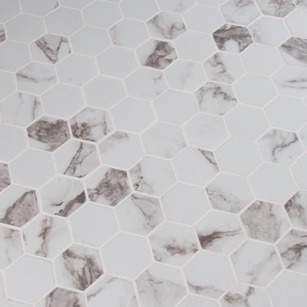 This Statuario Hexagon Porcelain Mesh-Mounted Mosaic Floor and Wall Tile comes in 1 sq. ft. sections for ease of installation and offers a lovely marble look with stunning whites and dramatic gray veining that delivers class and graceful style in durable porcelain. This tile features 2 in. hexagon chips on a 12 in. x 12 in. mesh-mounted mosaic sheet with a smooth finish and can be used for whole floors or wall sections or trimmed to provide a striking accent as desired. Use the tile in various areas around the home for medium-duty flooring such as in kitchens, hallways or even outside around terraces or balconies. The slip-resistant design is recommended for indoor use.