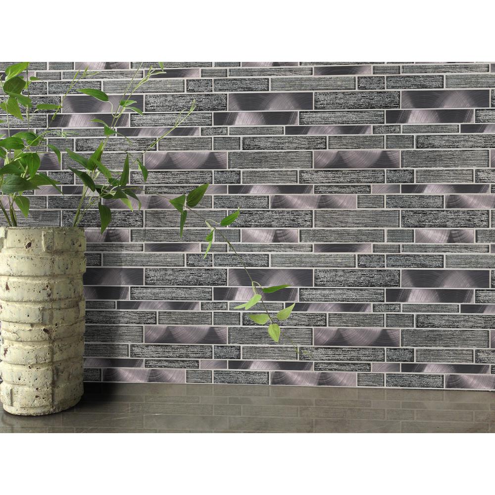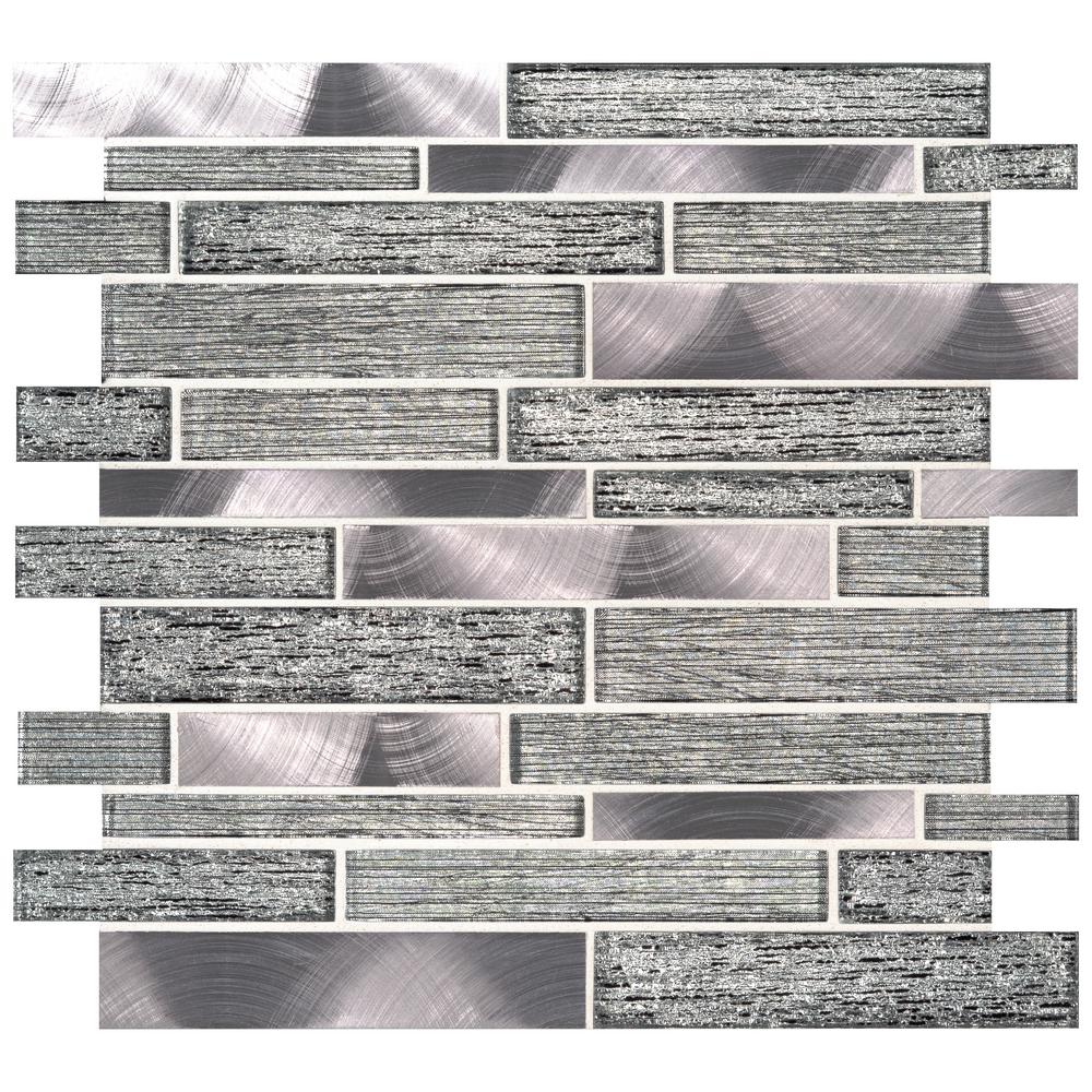 Each 11.73" x 11.61" mesh-mounted sheet contains varying lengths and widths of glass and metal bricks, creating a visually captivating random pattern. The 8mm thickness ensures durability while maintaining a sleek profile. Designed for glue-down installation using latex-modified thinset, this mosaic offers superior bond strength and long-lasting performance.