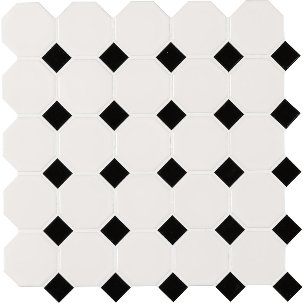 Add a splash of sophistication to your decor with White and Black Octagon Porcelain Mosaic Tile. It features octagon pieces of elegant white porcelain with black chips in between, lending a chic look and contemporary flair to any interior or exterior space. The low sheen, smooth-finished chips are precisely arranged on a 11-1/2 in. x 11-1/2 in. mesh-backed mosaic, which seamlessly interlocks with other tiles to create a transition- appearance.
