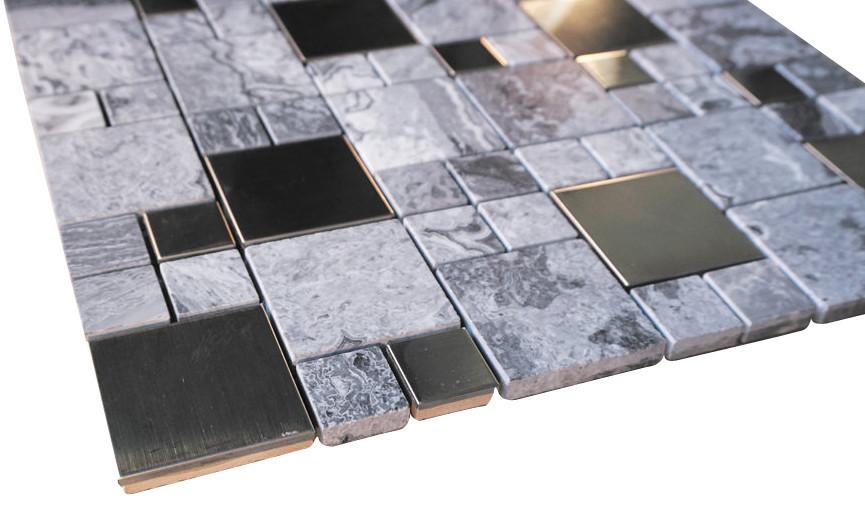 Sheet Size: 11 3/4" x 11 3/4" x 3/8"Tile Size: Random SquareType: Stone & Stainless SteelFinished: Brushed,...