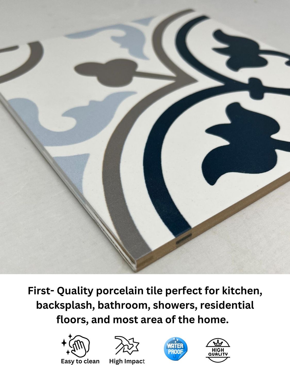 Provenza Square 8x8 Gray White Blue Compact Porcelain Floor Tile Matte for Kitchen Wall, Bathroom Shower, Laundry Room, Accent Wall
