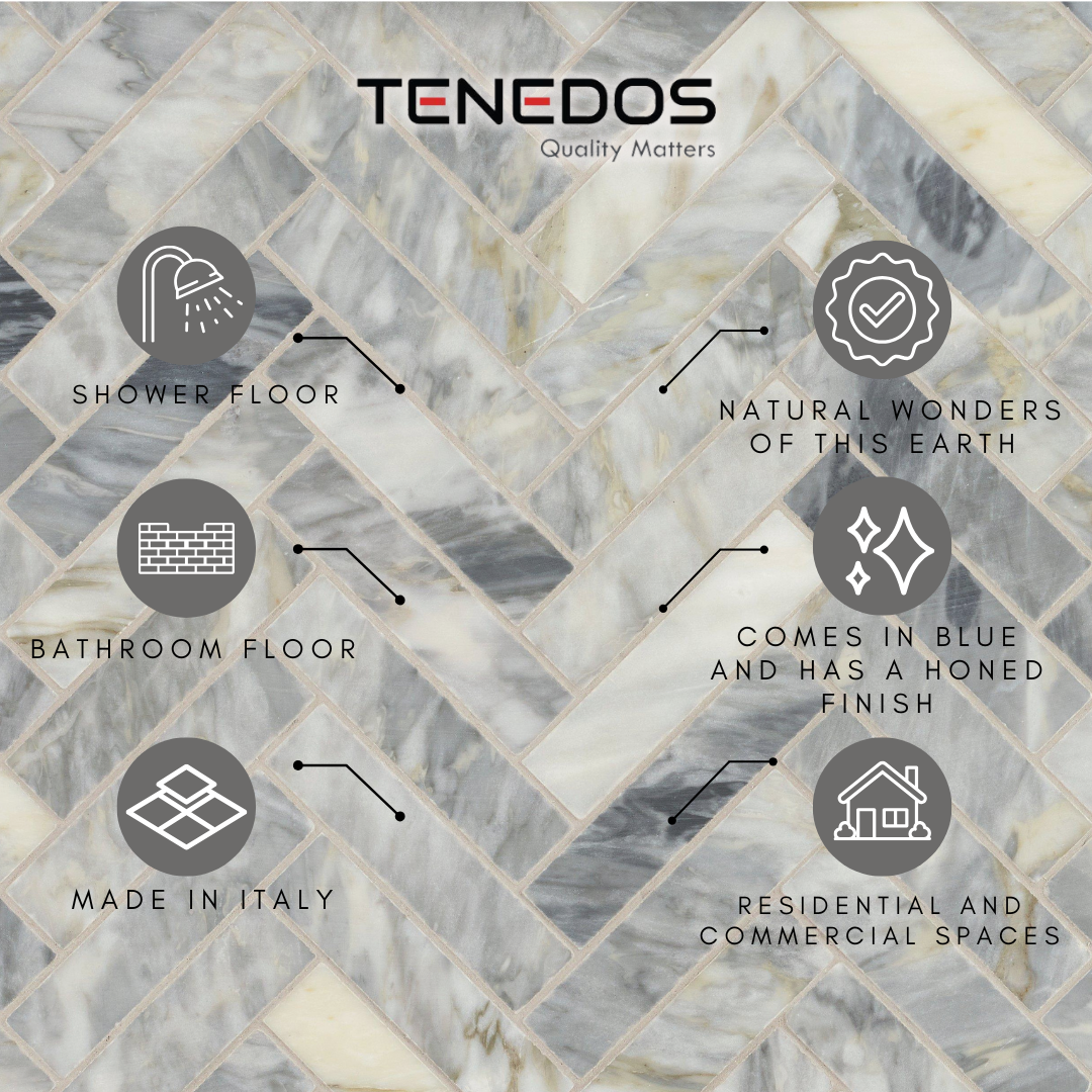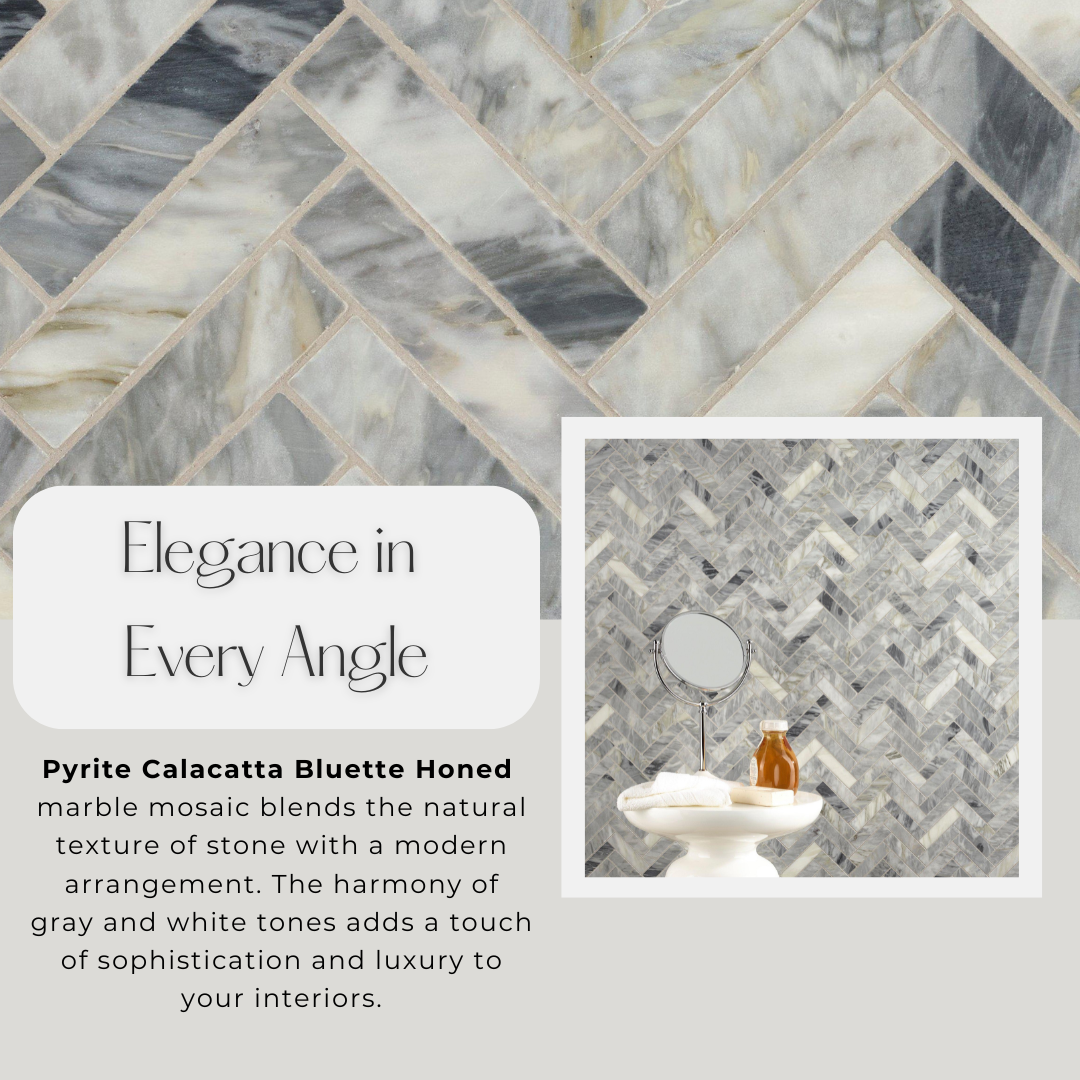 The Pyrite Calacatta Bluette Honed is a stunning natural stone that adds a touch of timeless elegance to any space. This 10 x 11 decorative tile, available in blue, features a honed finish, giving it a smooth, matte appearance. Marble is always in style, offering versatility and a distinctive look that sets your design apart.