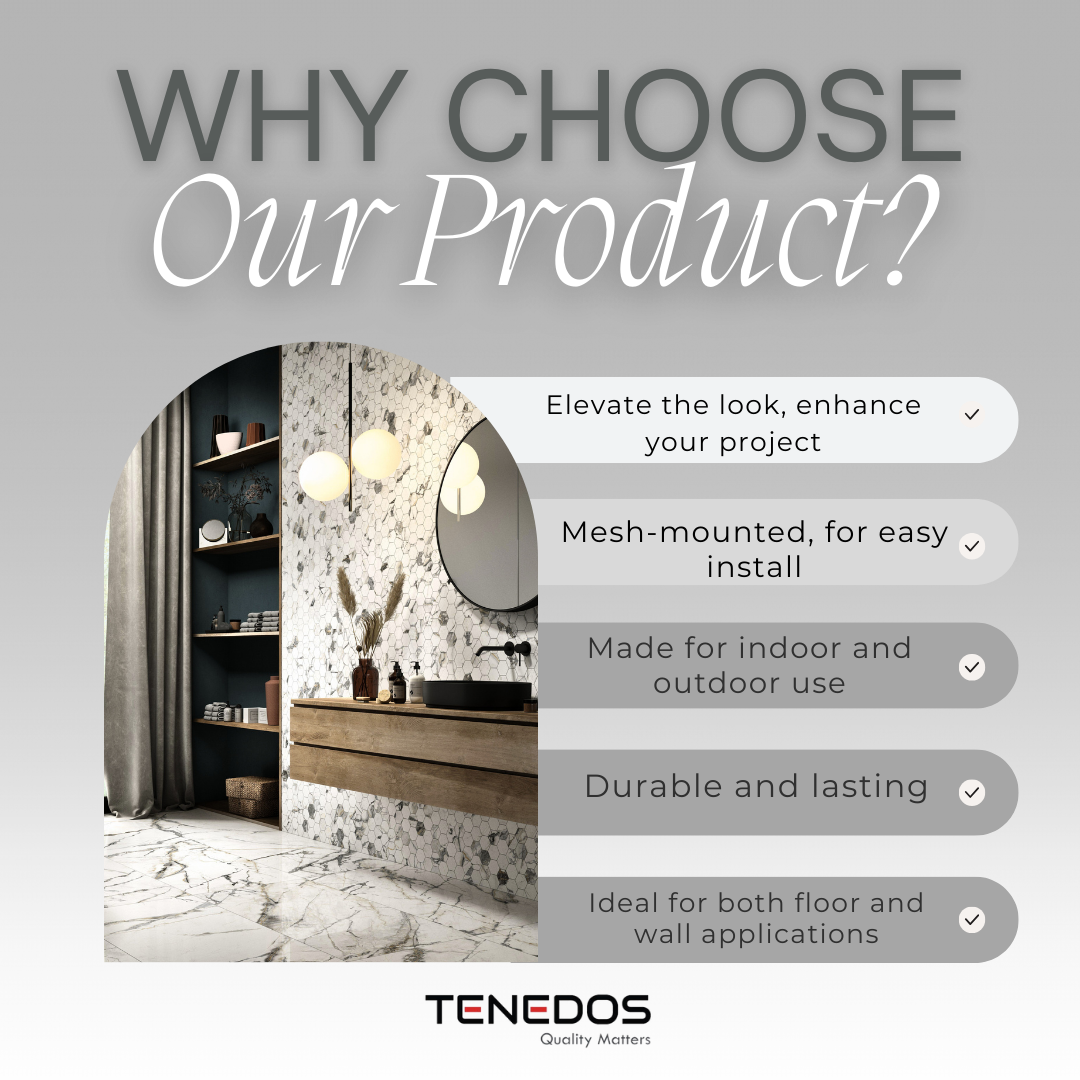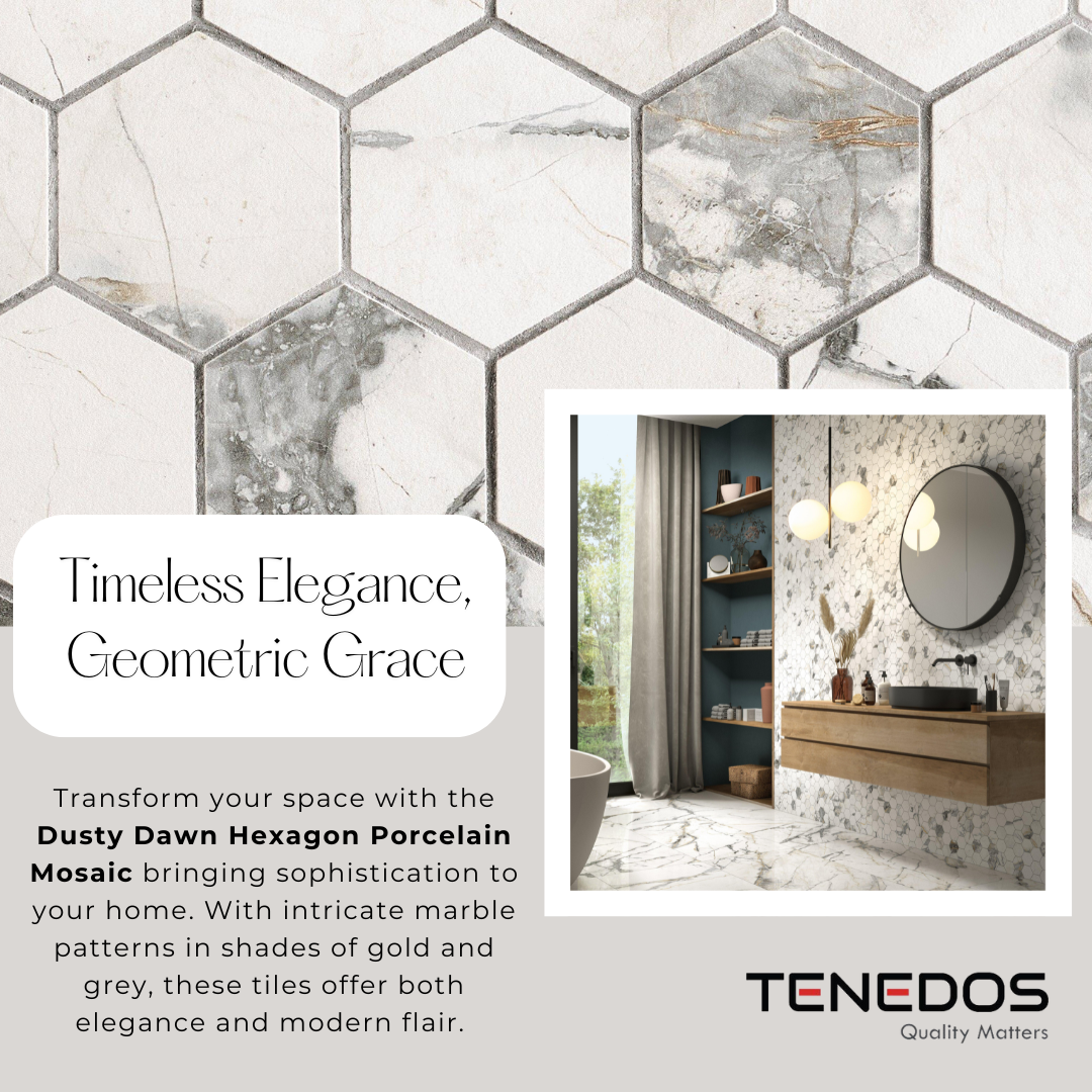 Designed for effortless installation, the Tenedos Dusty Dawn Hexagon Porcelain Mosaic Tile can be laid over existing tile or subfloors, saving you time, stress, and mess. Plus, with its 50% increased slip resistance compared to standard tiles, you can enjoy both beauty and safety in your home. Elevate your decor with this chic and versatile tile that adds a sophisticated touch to any room.