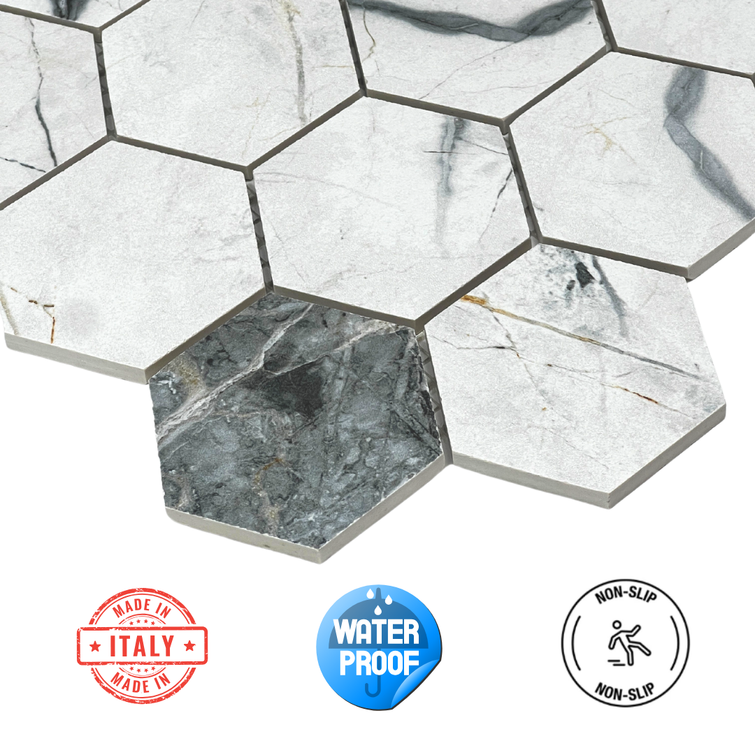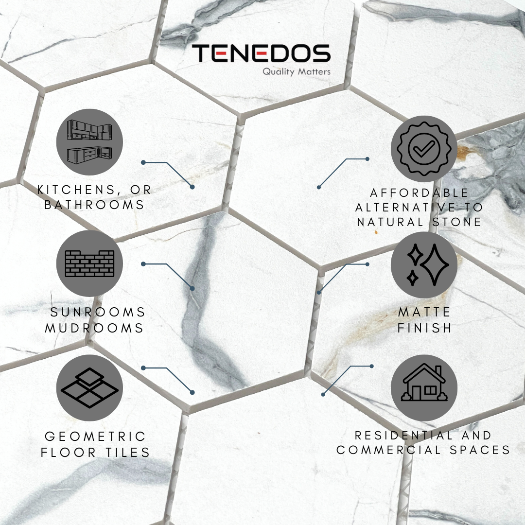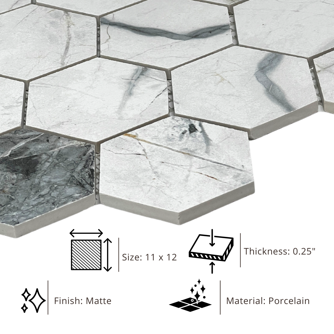 Transform any space with the Tenedos Dusty Dawn Hexagon Porcelain Mosaic Tile. This stunning tile features a matte finish and a unique hexagonal design, perfectly combining elegance and functionality. Measuring 11 x 12 inches, it captures the classic beauty of marble while offering the durability and easy maintenance of porcelain. With a waterproof surface that requires no sealing, this stone-look tile is an ideal choice for both indoor and outdoor applications, including kitchens, bathrooms, sunrooms, and mudrooms. Crafted in Italy, it reflects old-world craftsmanship and timeless style.
