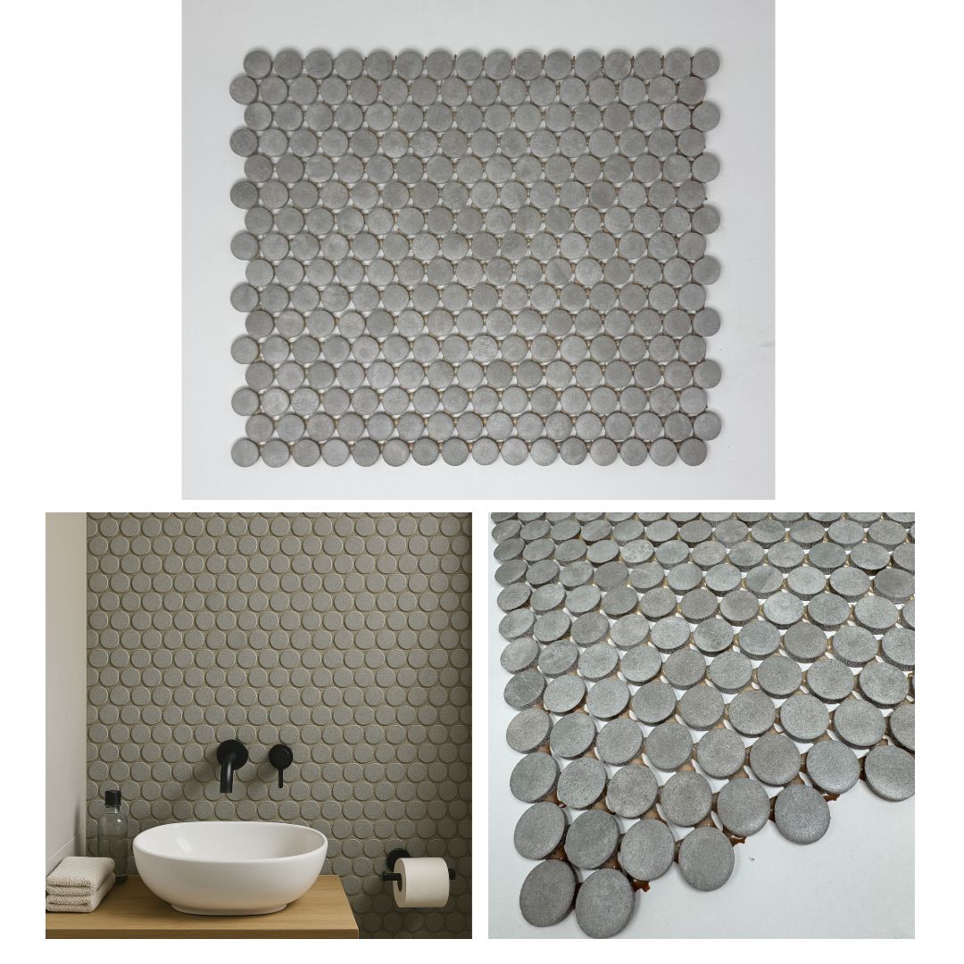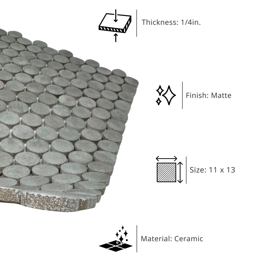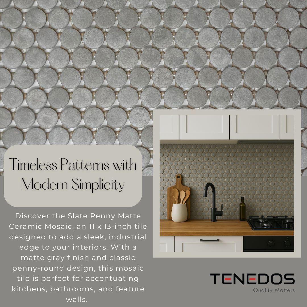 • Sophisticated Gray Cement-Look Finish: The Slate Penny Matte Ceramic Mosaic Tile features a sleek gray finish with a cement look, adding a modern, industrial touch to any space.