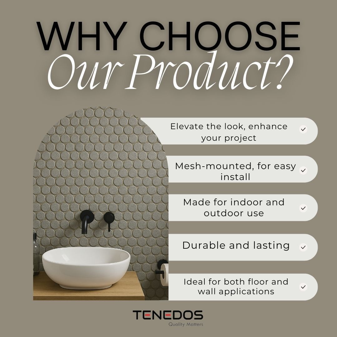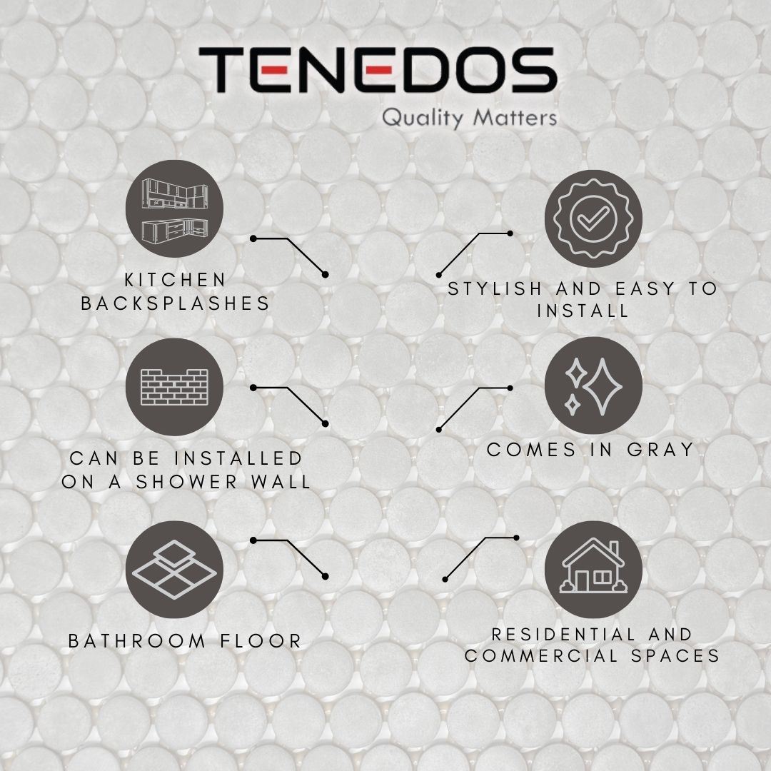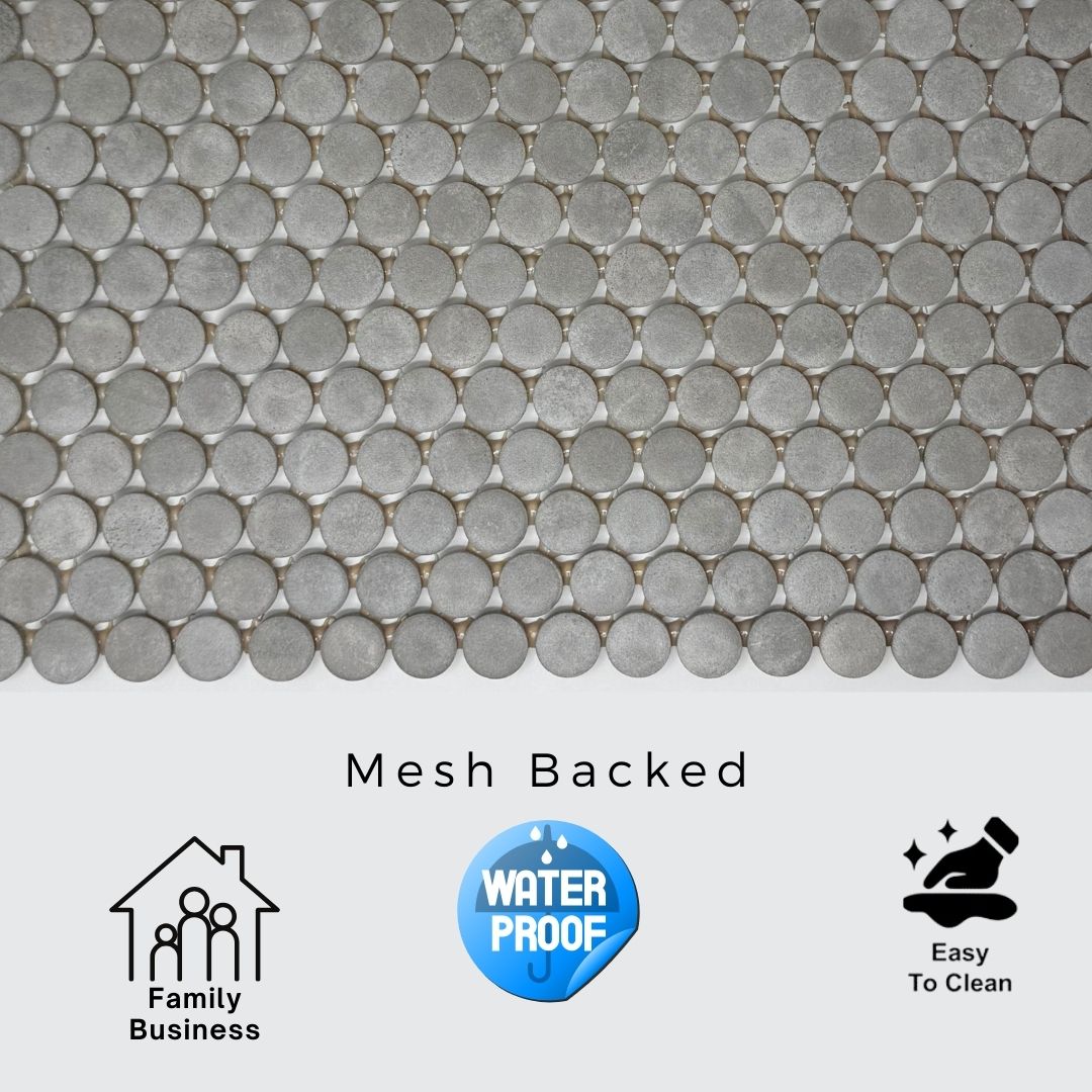 • Sophisticated Gray Cement-Look Finish: The Slate Penny Matte Ceramic Mosaic Tile features a sleek gray finish with a cement look, adding a modern, industrial touch to any space.
