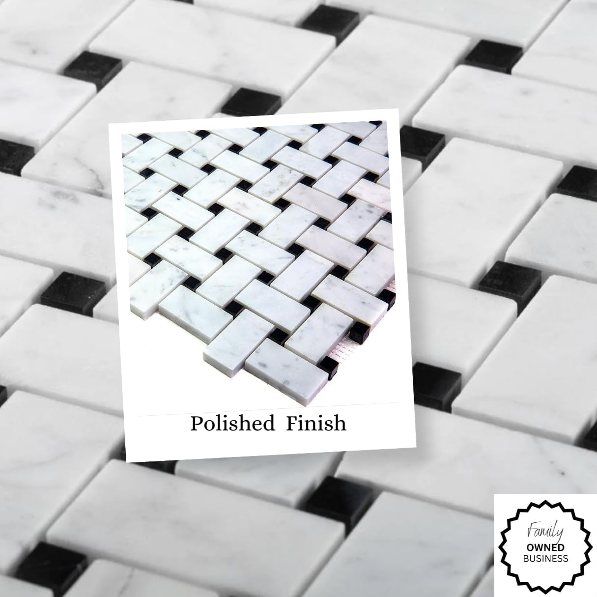 The basketweave pattern of these tiles offers a unique and visually interesting design that adds texture and visual depth to floors and walls. The interlocking rectangles create a sense of movement and flow, while the black dots add contrast and accentuate the geometric pattern, resulting in a striking and sophisticated look.