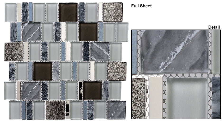 Make a striking design statement with Obsidian Frost, a breathtaking blend of sleek glass, textured stone, and brushed metallic accents. Inspired by icy cliffs and volcanic rock, this unique mosaic tile sheet captures the drama of deep charcoal, cool gray, and soft silver in a timeless, high-contrast design. 🖤🌫️