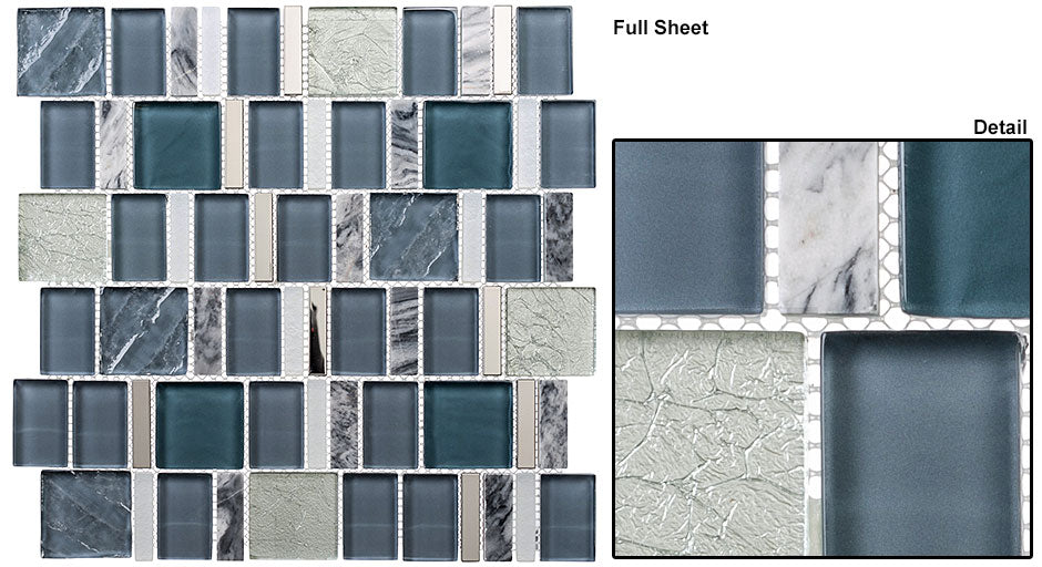 Tenedos Ocean Mist Mixed Glass & Marble Mosaic Tile โ 2โ Random Width, Mesh-Mounted Sheet for Backsplash, Shower & Accent Wall
