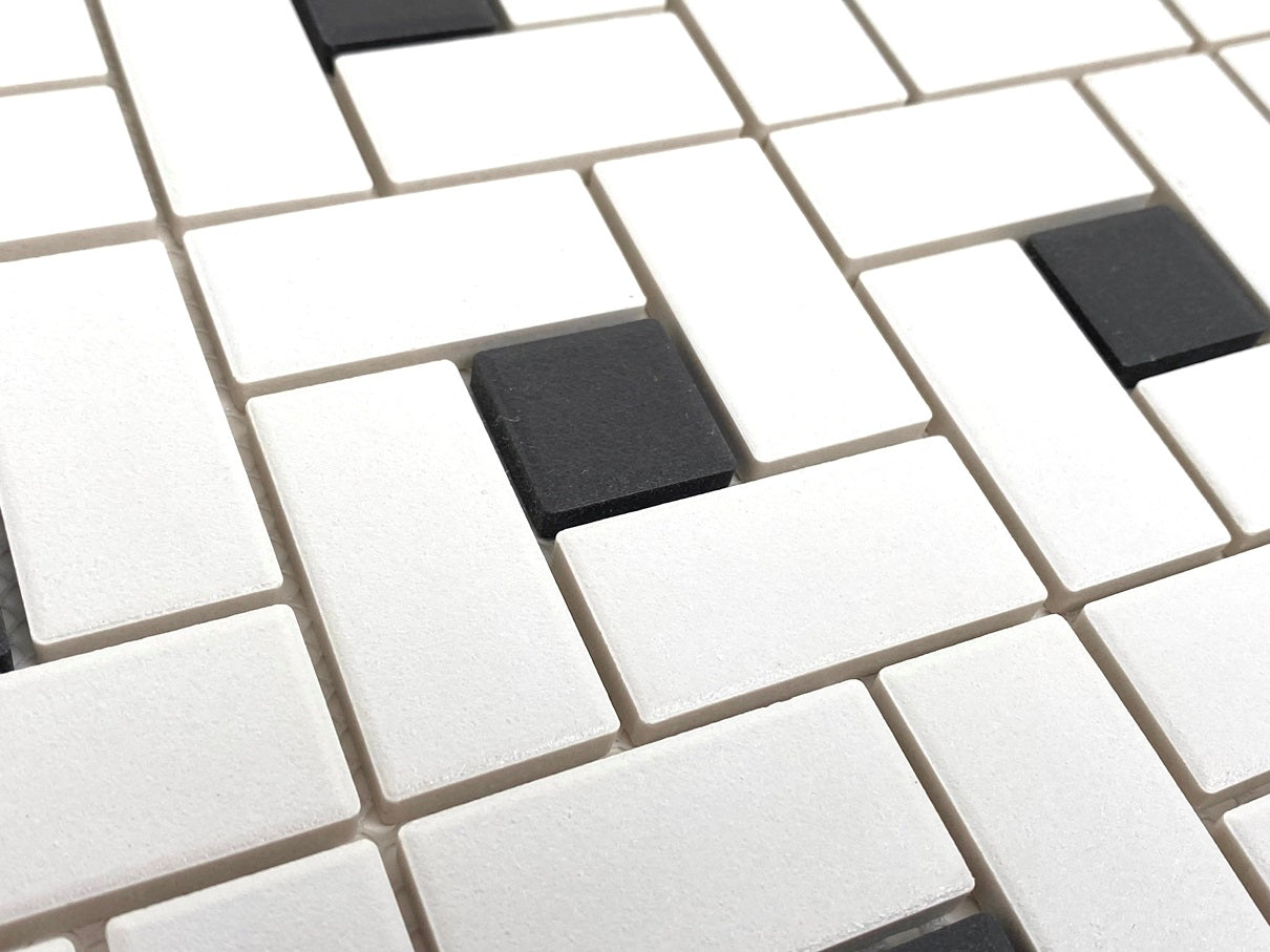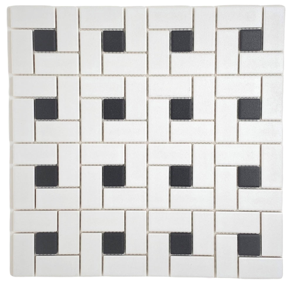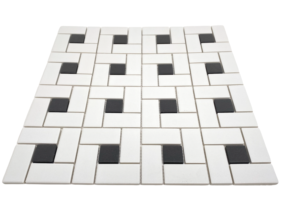 Bring timeless elegance and modern simplicity to your space with the Tenedos White & Black Pinwheel Porcelain Mosaic Tile. Featuring a clean white base accented with soft black (greyish) dots, this unglazed porcelain mosaic showcases the classic spiral pinwheel pattern, perfect for adding subtle visual interest to floors and walls.