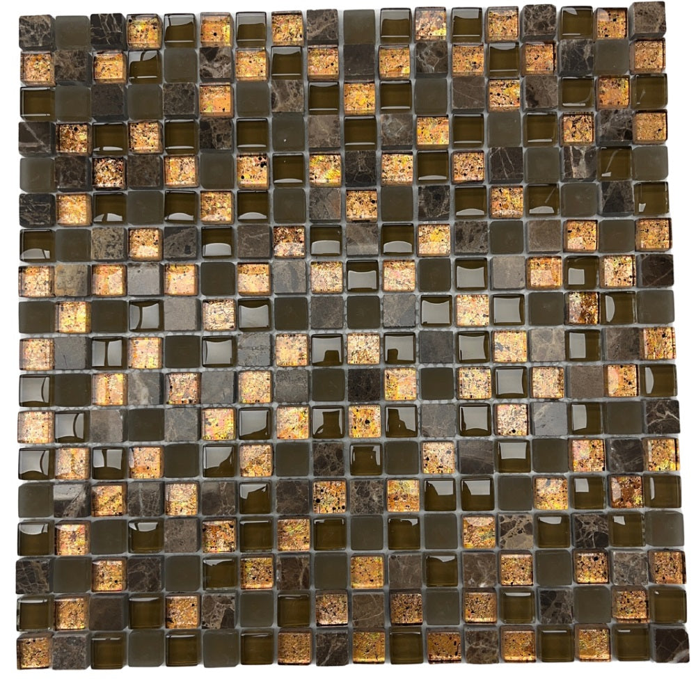 Tenedos Square 5/8 Dark Emperador Marble with Brown Frosted and Bronze Copper Glass Wall Decor Tile is the perfect addition to a kitchen backsplash or bathroom shower. Its unique blend of marble and glass gives your space a distinctive look, adding both texture and warmth. With a range of sizes, this tile can be put to work in accent walls for an elegant and professional finish.