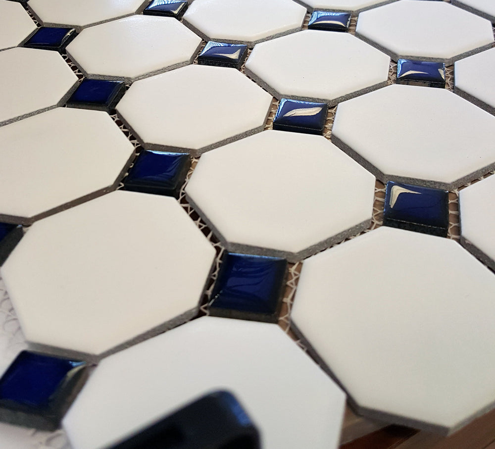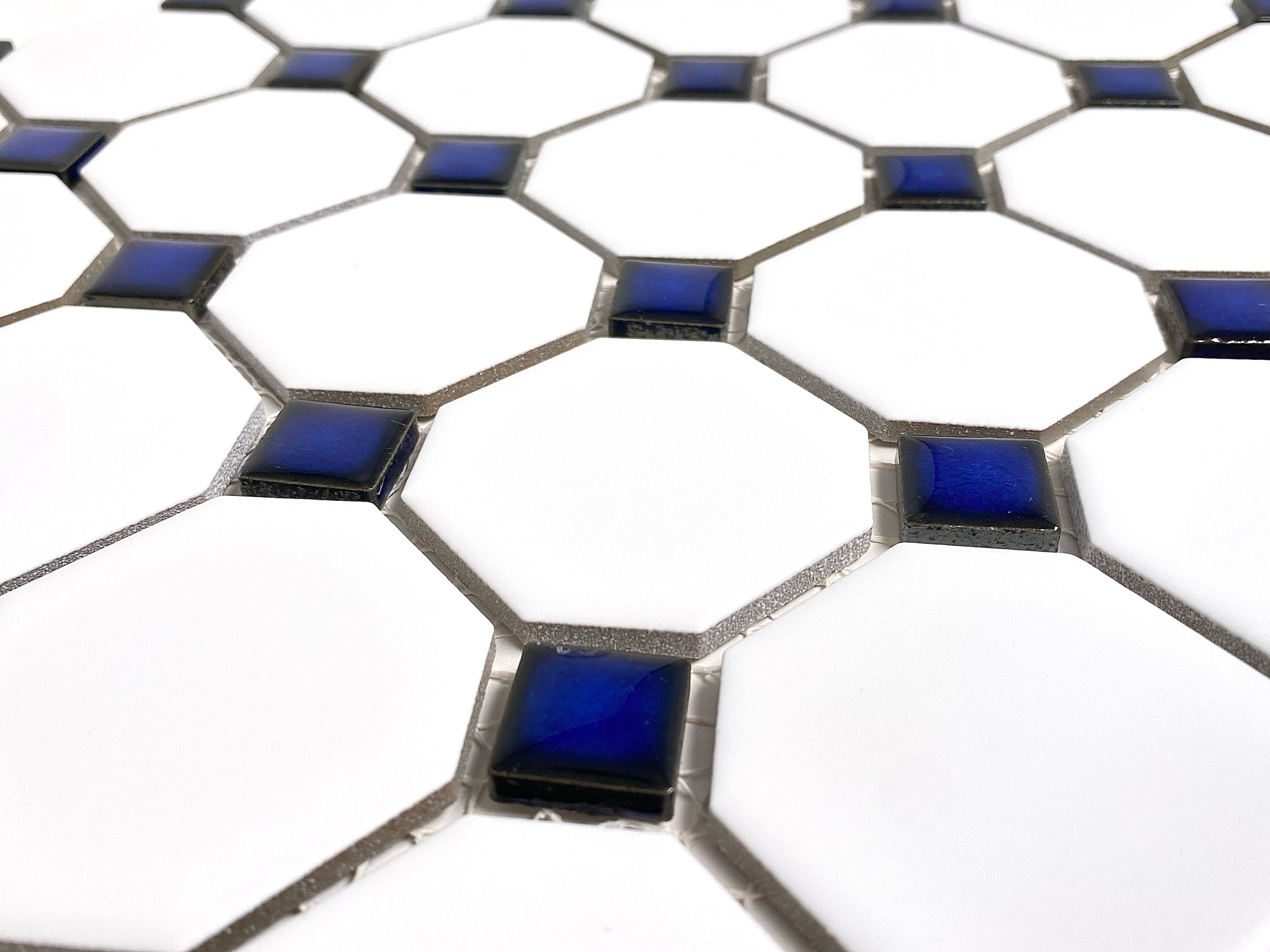 Crafted with precision, the Matte White Octagon with Glossy Cobalt Blue Dots Porcelain Mosaic boasts easy installation, cleaning, and maintenance. Sold by single sheet or in boxes of 20 sheets, it offers convenience and flexibility for your design needs.