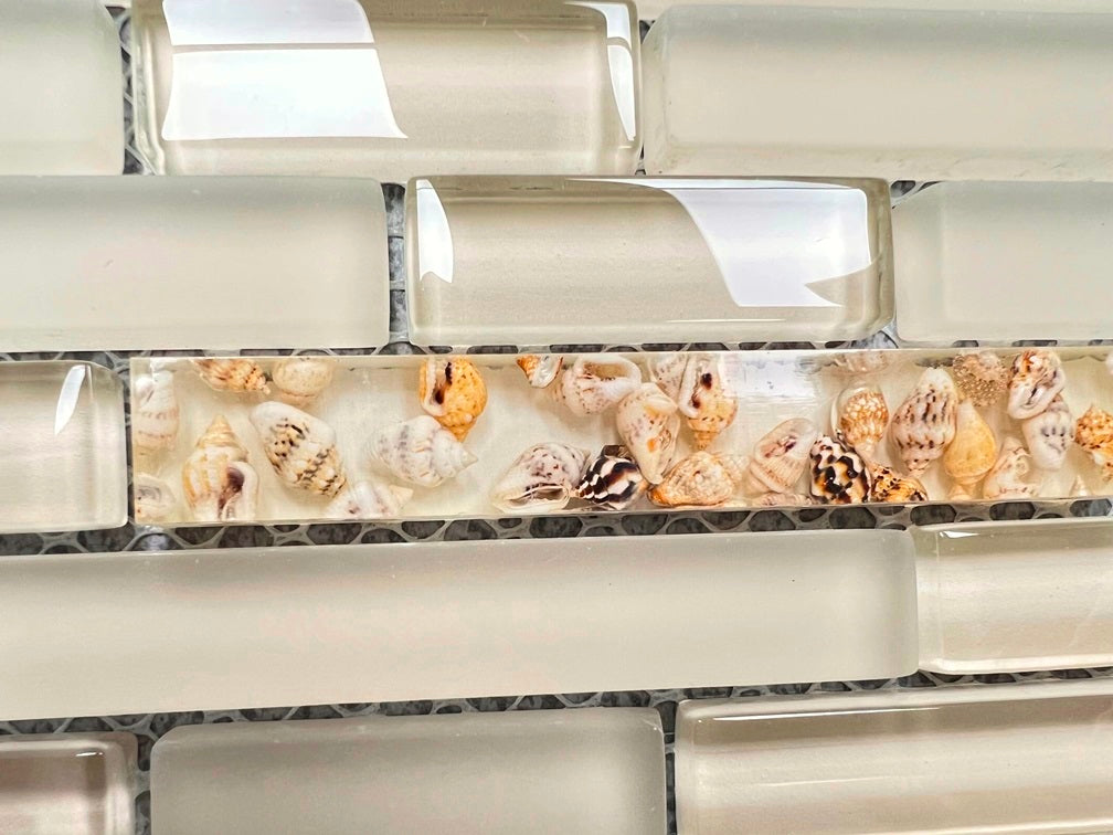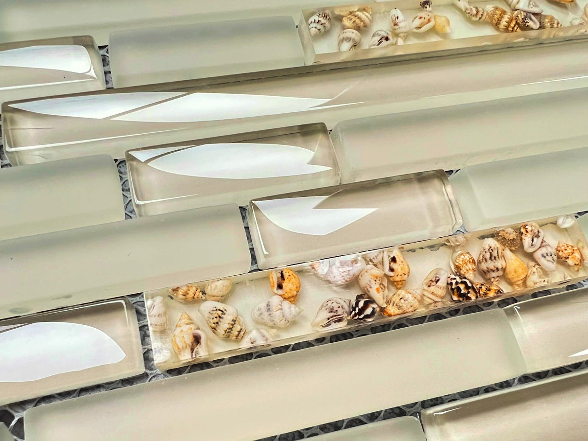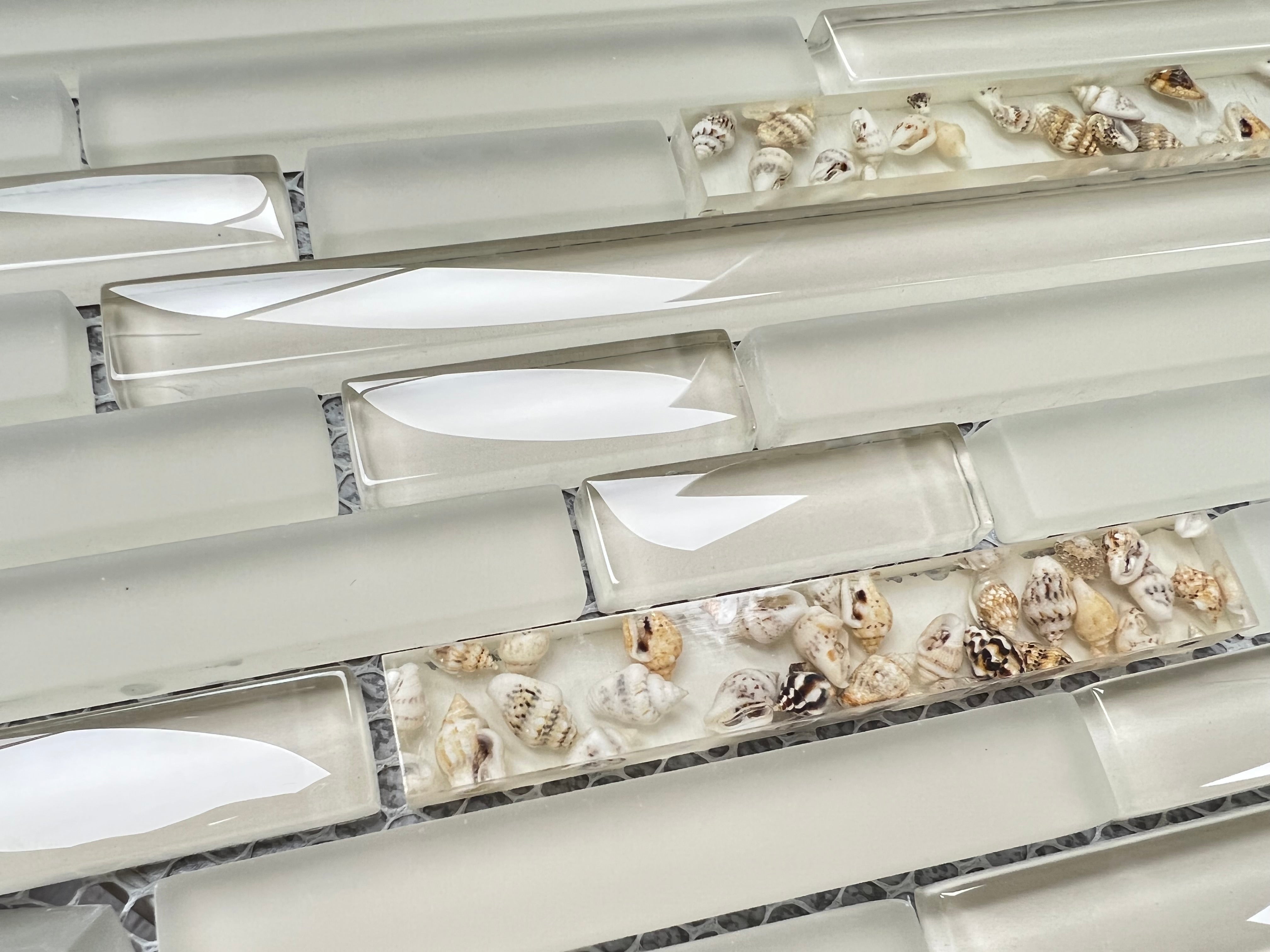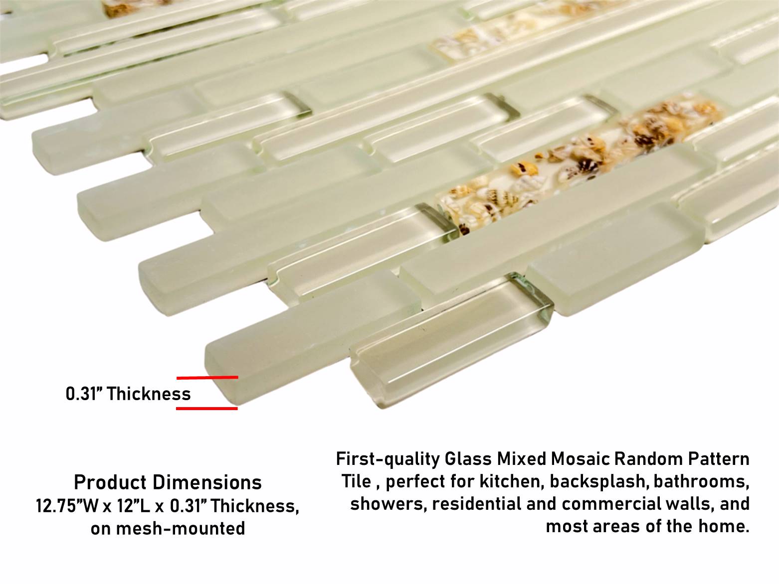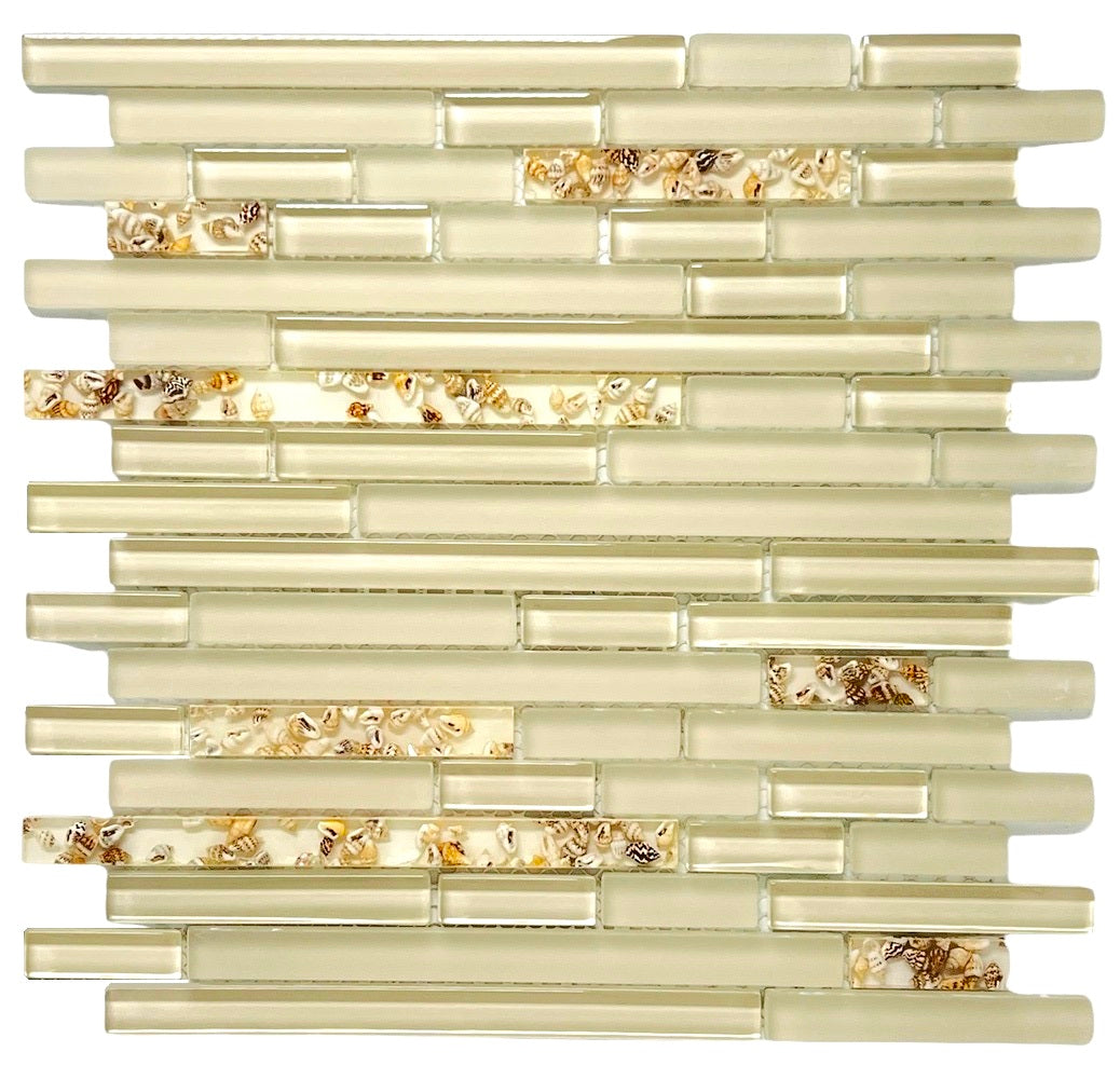 Enhance any wall with this stunning Tenedos Seashells Glass and Mixed Mosaic pattern tile from Italy. The large 12"x12" random pattern backsplash and bathroom wall tile is perfect for adding texture and color to any space. The intricate glass detail is sure to create a unique design.