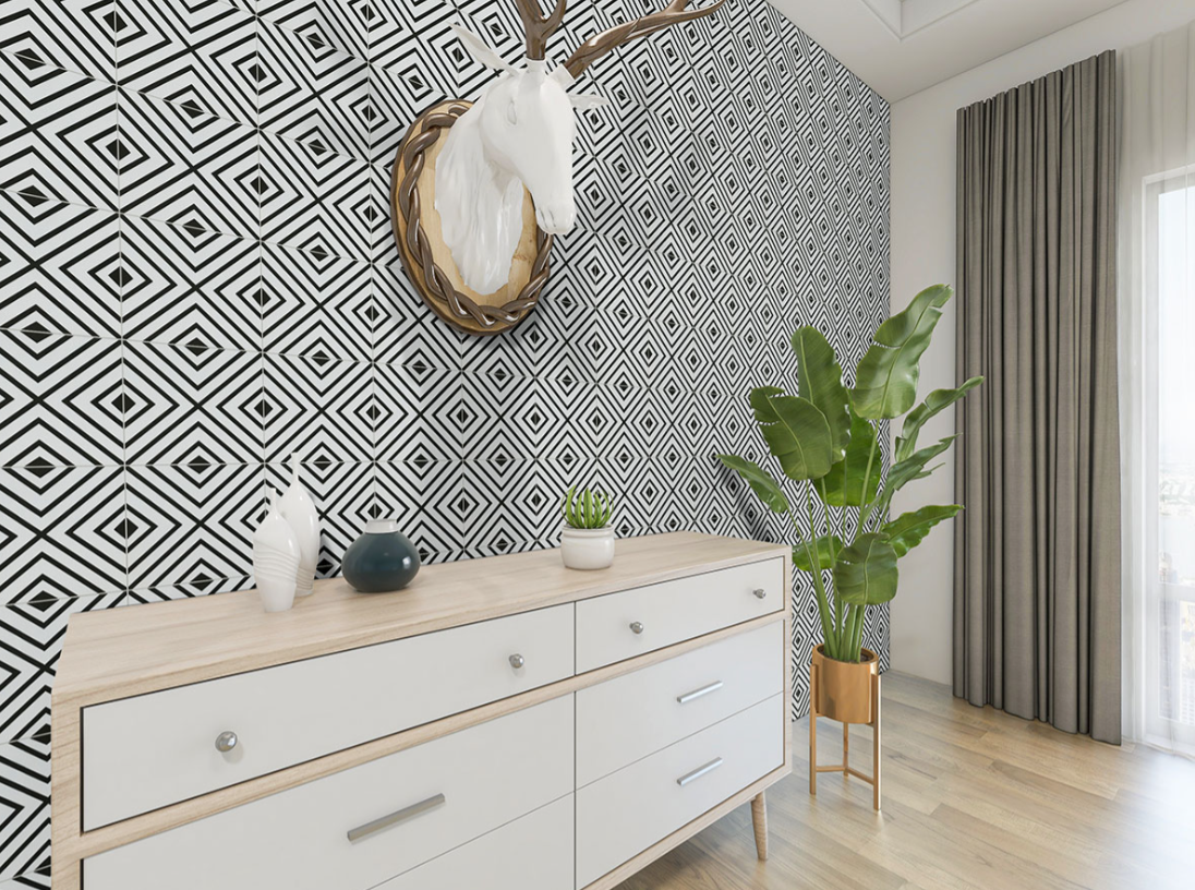 Introducing the Zaria Modena Encaustic Tile, a captivating addition to our Zaria Collection. Designed with a crisp white background and an elegant black diamond-inspired motif, this 8"x8" porcelain tile creates a bold yet timeless look that enhances any space. Each tile is carefully crafted to align seamlessly with others, forming a cohesive and sophisticated larger pattern. The matte finish provides a modern touch while also offering slip resistance, making it ideal for both residential and light commercial use. Built from durable porcelain, the Modena tile resists stains, moisture, and everyday wear, ensuring long-lasting performance in busy areas. With no sealing or special maintenance required, it’s perfect for kitchens, bathrooms, laundry rooms, showers, and entryways. Easy to clean and eco-certified for safe indoor use, the Zaria Modena tile brings both style and function to your design projects. Transform your space with the striking beauty of the Modena Porcelain Tile today.